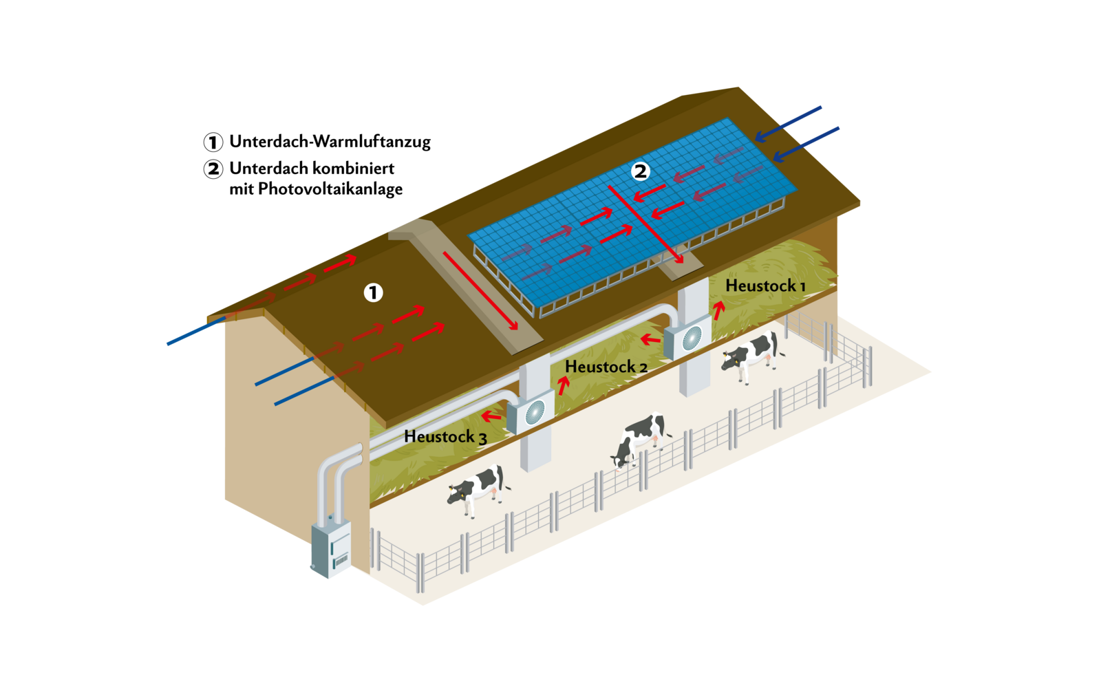 Diese Faktoren müssen zur Heustock- bzw. Lüftergrösse passen. Solche Werte sollten von einer Fachperson berechnet werden, damit am Schluss das ganze System aus Lüfter-, Unterdach- und Heustockgrösse aufeinander abgestimmt ist. Bei solchen Projekten ist es sinnvoll, mit der Beratungsperson und dem Zimmermann zusammen an einen Tisch zu sitzen.