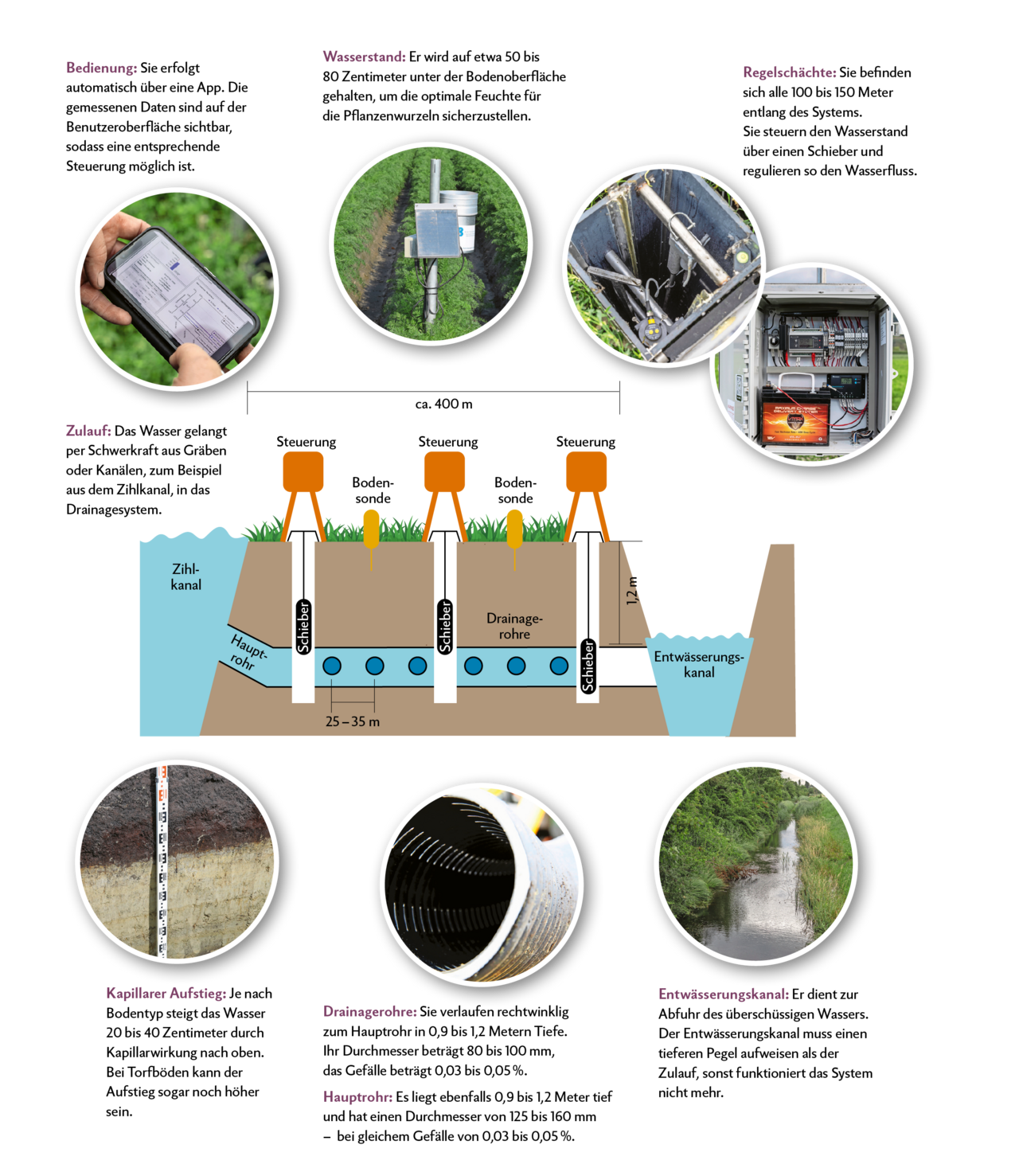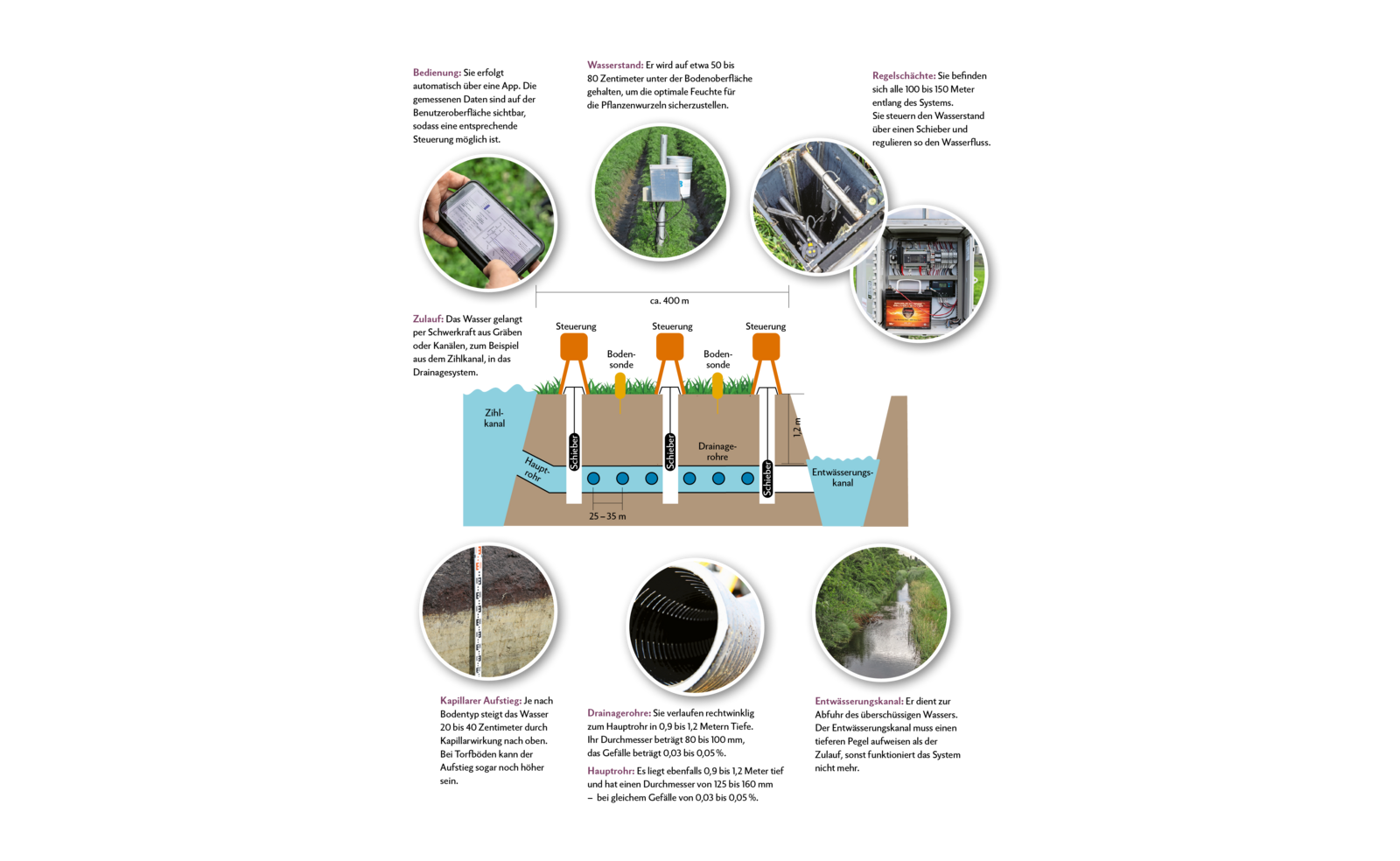 Heute jedoch verwandelt Matthias Schwab diese traditionelle Entwässerung in eine clevere Bewässerungstechnik: In Trockenperioden staut er das Wasser gezielt in den Drainagerohren, etwa 50 bis 80 Zentimeter unter der Bodenoberfläche. Das Wasser steigt dann langsam, fast von selbst, durch die Kapillarwirkung wieder in die Wurzelzone auf.