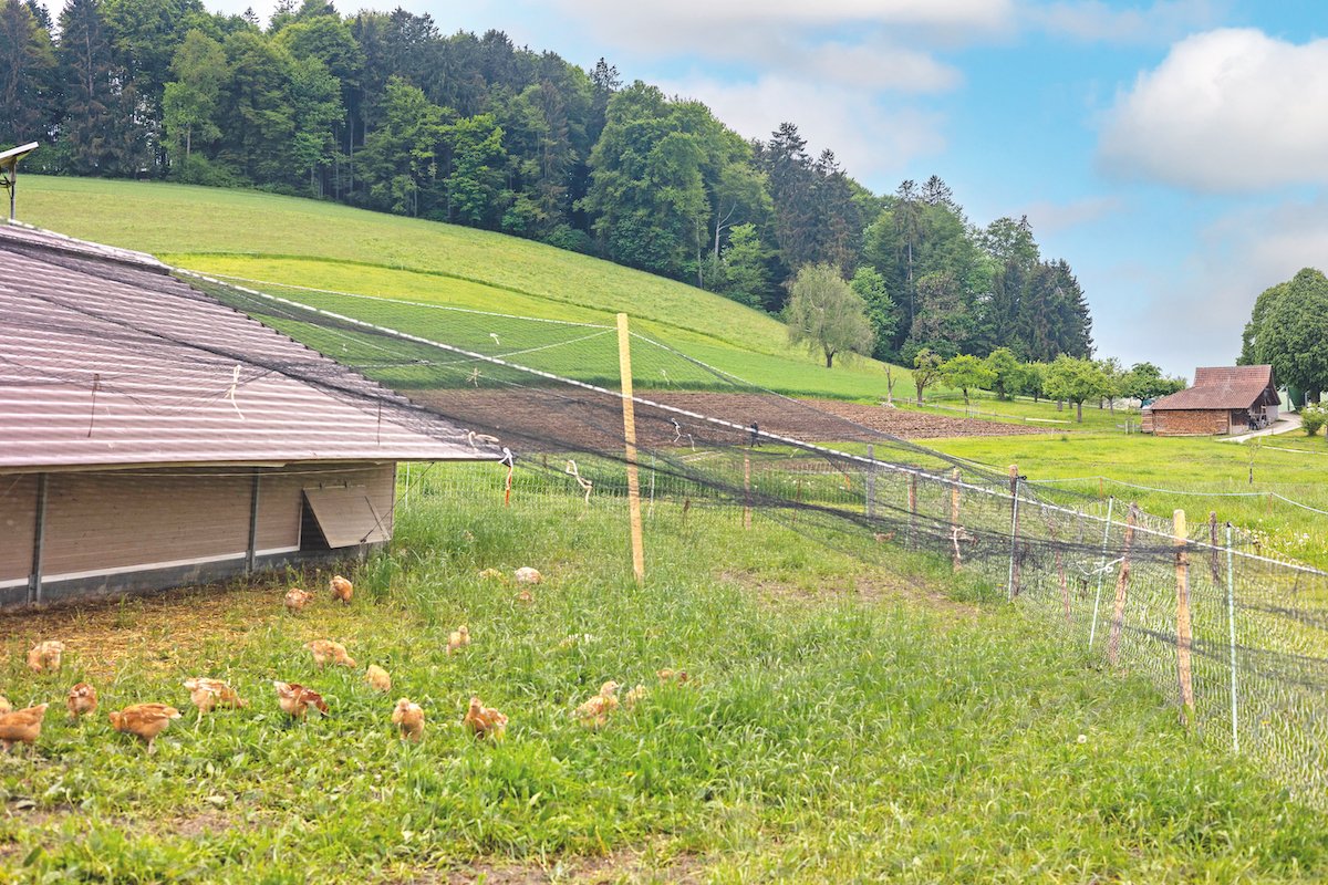 Aktuell sind es acht Streifen à 27 Meter, die von Bäumen eingerahmt sind. Auf einem stehen die mobilen Ställe der Hühner, auf einem wächst Urdinkel, auf einem Kräuter und auf zweien Gras. Roggli beweidet die Grasstreifen mit den Aufzuchtrindern, heut, siliert oder grast vor Schlechtwetterperioden ein, um die Weide zu schonen.