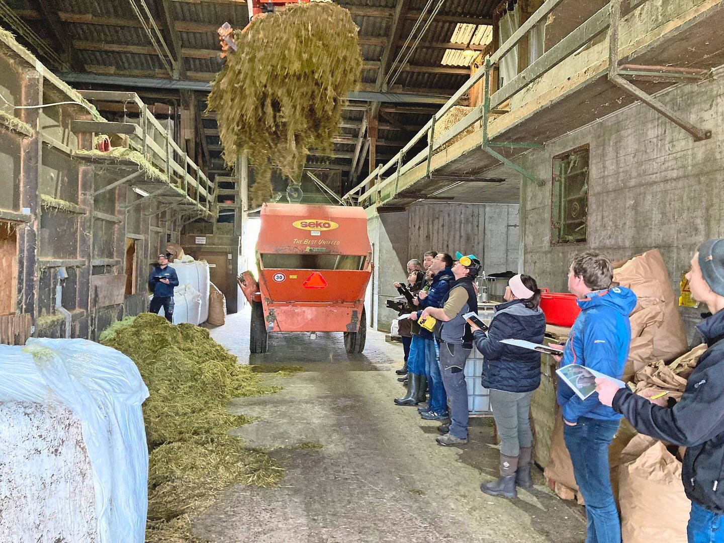 Während der Landwirt ganz normal sein Futter mischte, zeichneten seine Kollegen minutiös die Arbeitswege und die dafür nötige Zeit auf. Das ergab eine Diskussion darüber, wieso welcher Schritt wann erfolgt. Mit einer zweiten Kursgruppe wurde die Beobachtung am nächsten Tag wiederholt.