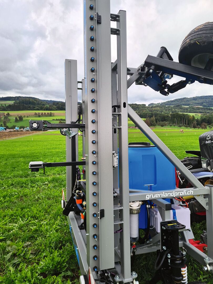 Die beiden Lohnunternehmer sind auch zufrieden mit der kompakten Abmessung der Maschine. Der Frontanbau bietet viele Vorteile, welche sich im Praxiseinsatz zeigten. So kann der Spritzbalken exakt an Weidezäunen entlang gesteuert und nahe um Pfosten herum gelenkt werden. Am Feldende kann bis zur Grenze behandelt werden. Für die Kamera ist die Blackenerkennung am Frontanbau sicher auch gut, weil Fahrspuren wegfallen und das Bild nicht verfälscht wird.