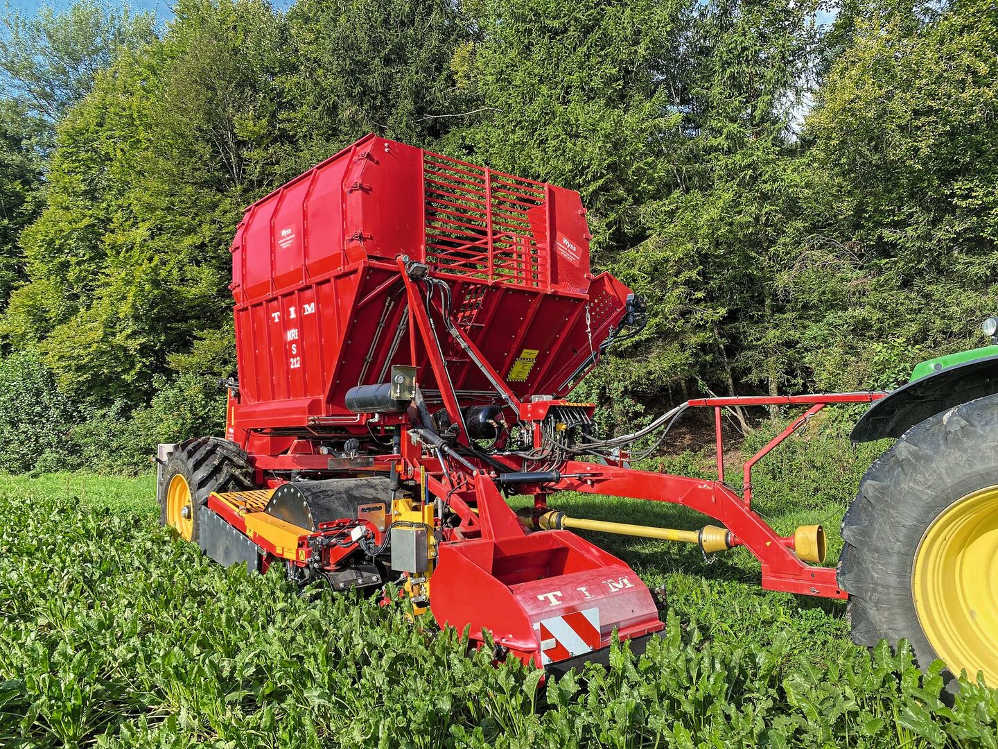Der dänische Maschinenhersteller Tim hat sich auf robuste gezogene Zuckerrüben-Vollernter spezialisiert, welche eine bodenschonende Ernte dank geringem Gewicht ermöglichen. Die zweireihigen Modelle lassen sich mit einem Traktor um 120 PS bedienen. Mit einem Integralhäcksler wird das Laub zwischen die Reihen platziert und anschliessend der Rübenkopf geschnitten. Laut Daniel Wyss werden die meisten Maschinen mit einem Roderad ausgerüstet. Gegenüber einem Rodeschar werden Rüben leichter aus dem Boden befördert. Vor allem habe es sich bei Situationen mit viel abgestorbenem Laub und leichten Böden als Vorteil erwiesen, da der Erntefluss besser gewährleistet ist und Verstopfungen vermieden werden. Bei besonders schwierigen Situationen sind auch aktiv betriebene Roderäder verfügbar, was jedoch nur in seltenen Fällen notwendig sei, so Daniel Wyss.