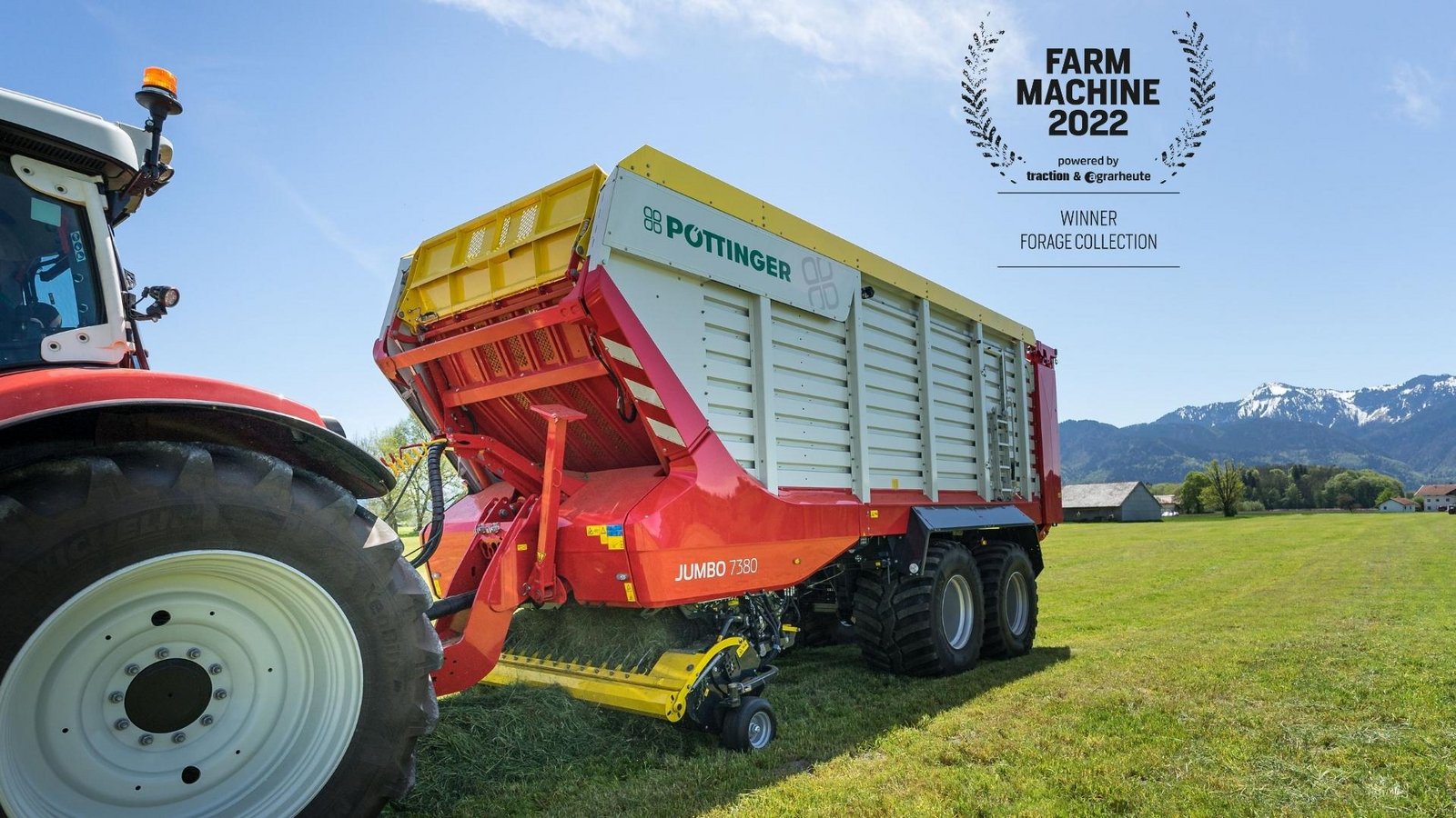 Der Ladewagen von Pöttinger gewinnt unsere Kategorie Futterbergung. Damit setzen sich die Österreicher gegen zwei sehr starke Konkurrenten in dieser Kategorie durch. Die internationale Jury lobt am Jumbo vor allem die Konstruktion des Powerbandes, das die Kraft des Traktors direkt an das Winkel-/Planetengetriebe des Rotors weitergibt. Jury-Mitglied Evelyn Schmailzl, Redaktion traction: «So verarbeitet der Ladewagen bis zu 500 PS vom Traktor und ist der Erste, der diese Marke knackt.»