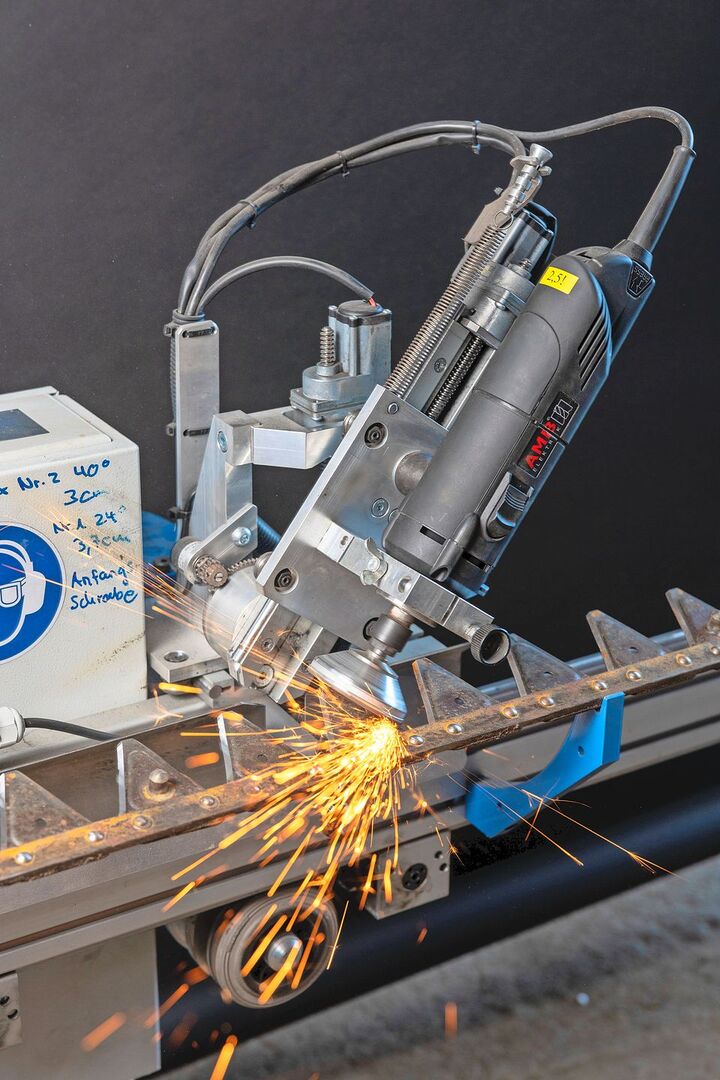 Die Klingen des Doppelmessermähwerks von Hand mit dem Winkelschleifer zu schärfen erfordert viel Fingerspitzengefühl und birgt ein hohes Fehlerpotenzial. Daher wird grundsätzlich davon abgeraten, ohne Führung zu schleifen. Tobias Kälin junior aus Bennau SZ meint dazu: «Kannst du vergessen, dass das gut und scharf wird.»