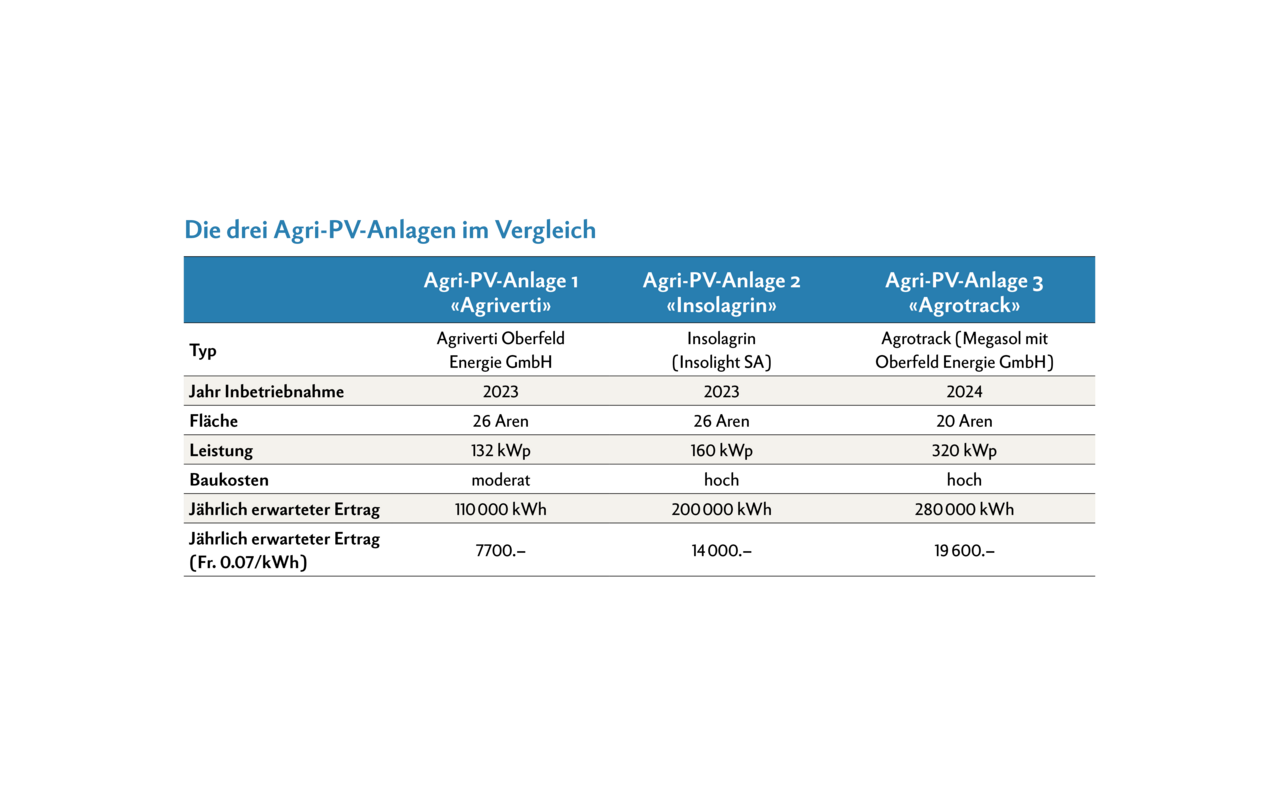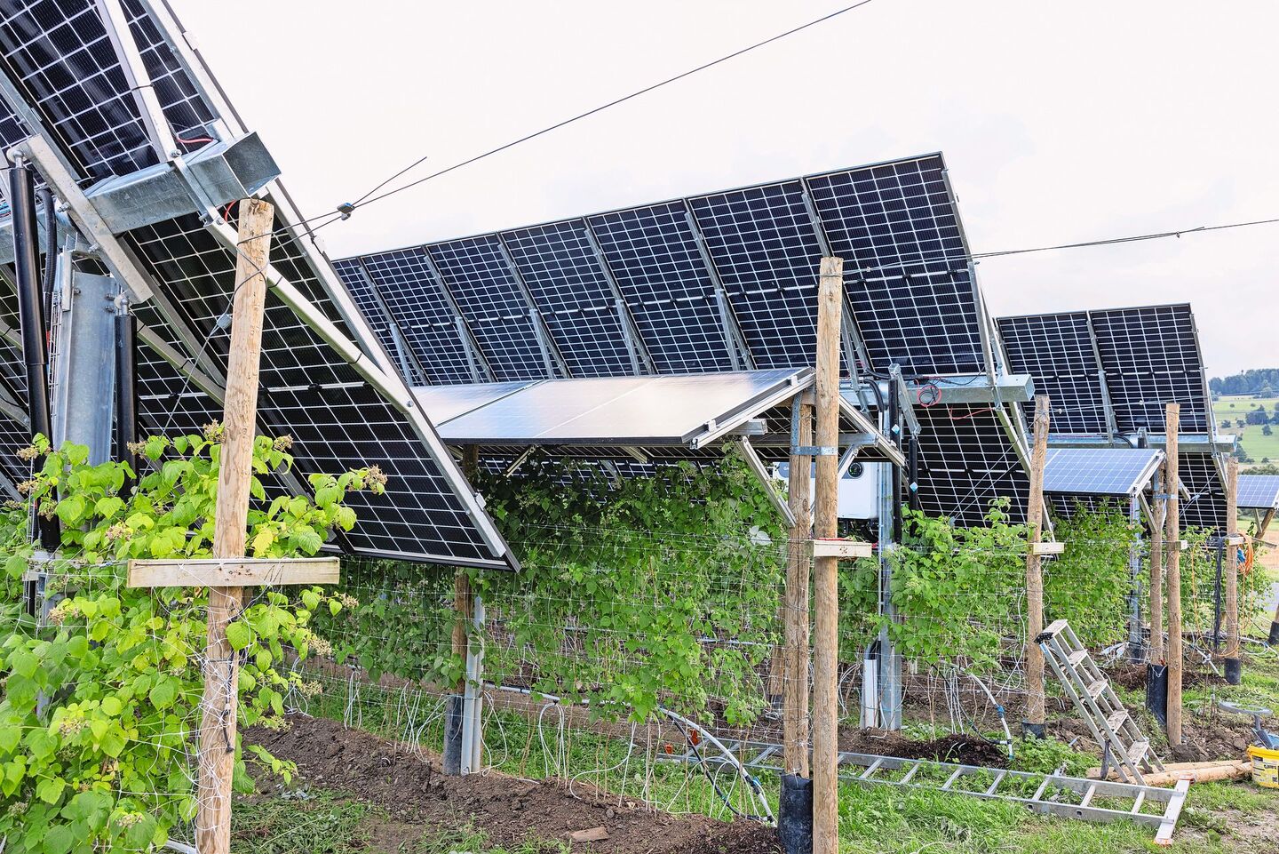Das gilt insbesondere für intensiv bewirtschaftete Flächen wie Beerenkulturen; im Ausland auch für extensivere Formen der Landwirtschaft, etwa wenn die Flächen unter den Panels als Weiden genutzt werden. So verdunstet weniger Wasser, Böden trocknen weniger aus und Tiere liegen an heissen Tagen gerne im Schatten der Panels.