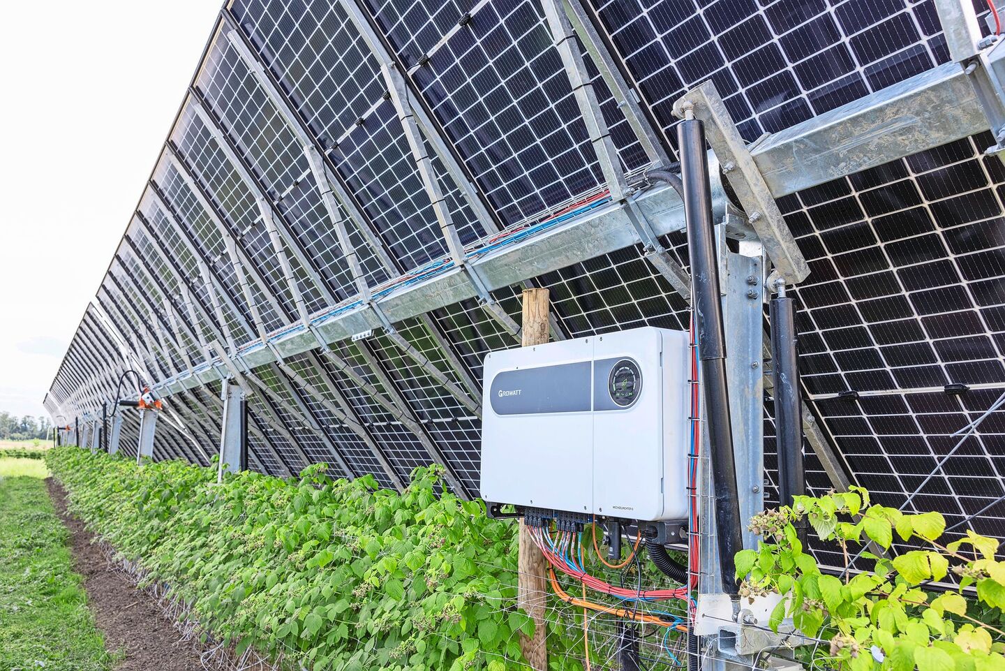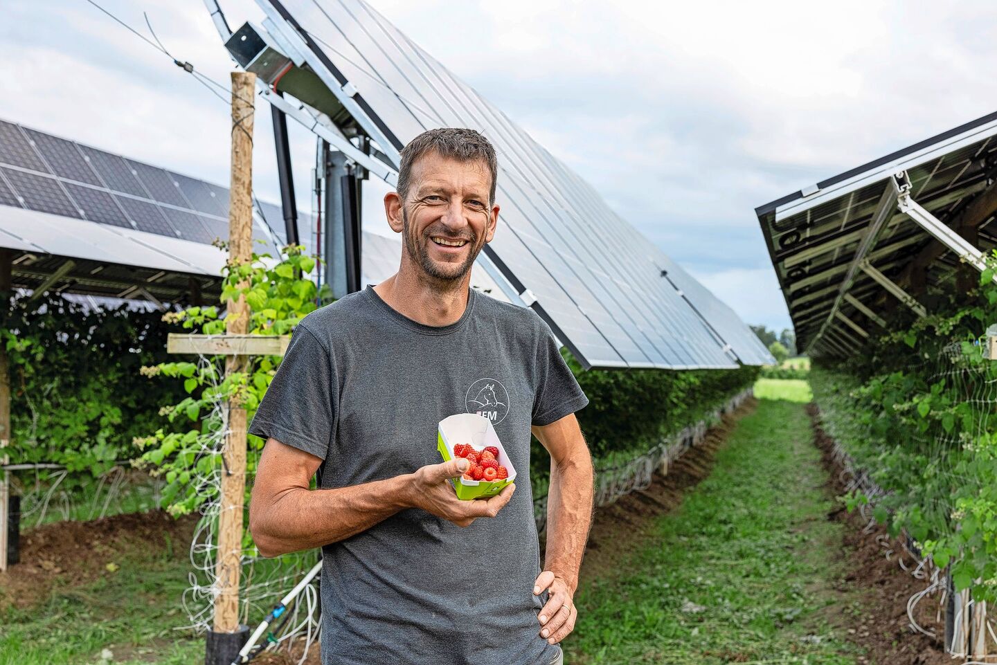 Die «Agriverti»-Anlage besteht aus bifazialen Panels, die auf beiden Seiten Strom erzeugen. Diese sind vertikal angeordnet, aber nicht in Süd-Ausrichtung, sondern in Ost-West-Ausrichtung. «Das ergibt insgesamt etwas weniger Stromertrag. Dafür haben wir ein sehr vorteilhaftes Produktionsprofil», erzählt er. Denn die Panels beginnen mit den ersten flachen Strahlen der Morgensonne mit der Stromproduktion und reduzieren die Leistung, je höher die Sonne am Himmel steht. Denn dann liefern alle anderen PV-Anlagen sehr viel und müssen unter Umständen sogar abgeschaltet werden. Gegen Abend, wenn die Sonne wieder niedriger steht, steigt der Ertrag wieder. Gleichzeitig ist es an sonnigen Tagen gegen 16 Uhr jeweils am heissesten zwischen den Himbeerstöcken. Das mögen die Beeren nicht. Doch genau um diese Zeit stehen sie dann im Schatten der Panels.