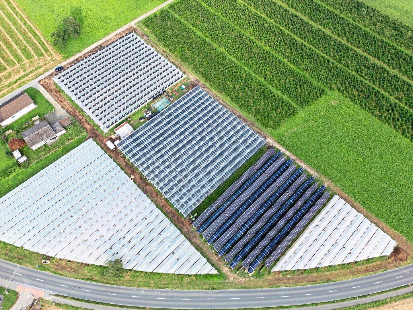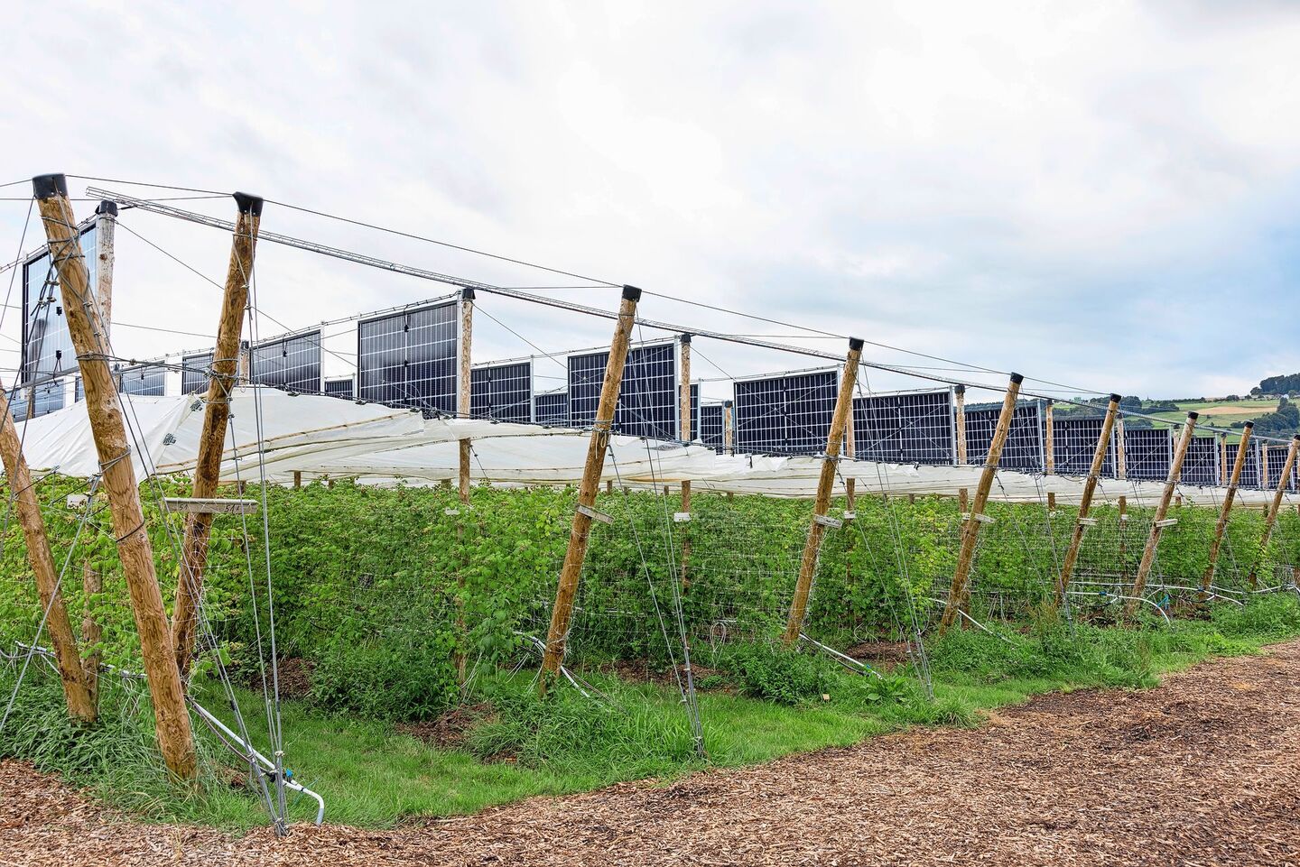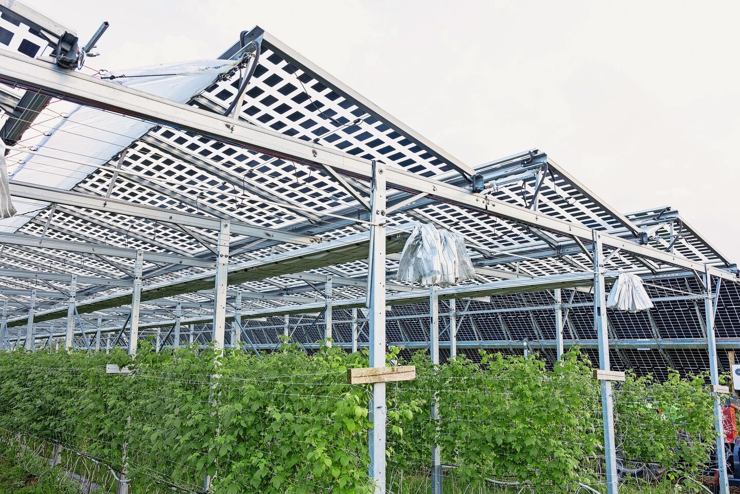 Mittlerweile stehen auf etwa der Hälfte seiner 1,5 Hektaren Pachtland mit Beerenkulturen Agri-PV-Anlagen. Zu jener auf den Holzpfählen sind zwei weitere dazugekommen. Alle tragen bifaziale Panels, die auf Vorder- und Rückseite Strom erzeugen und ein komplexeres Zusammenspiel von Beerenplantage und Stromerzeugung ermöglichen. An den Unterkonstruktionen für die Panels hängen Folien, welche die Beeren vor Frost, Sonne und Hitze schützen können und gleichzeitig mit ihrer silbrigen Oberfläche Licht auf die Rückseiten der Panels reflektieren. Die Schutzfolien werden computergesteuert geöffnet und geschlossen.