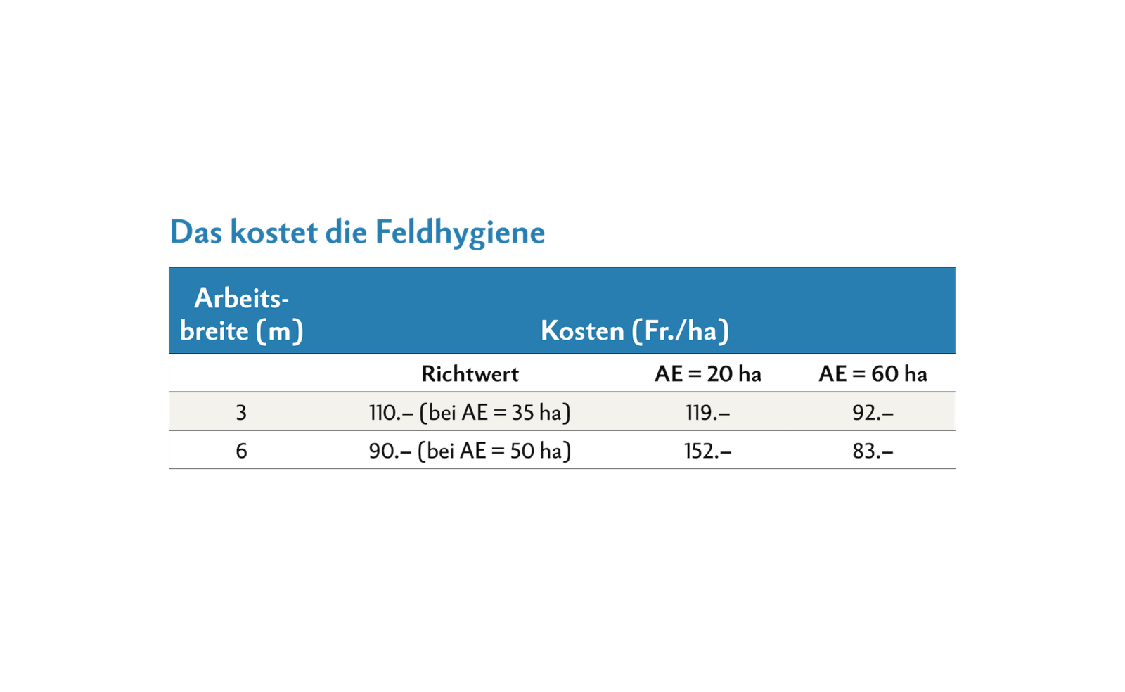 Wenn sich nun einer der Betriebe selbst mechanisiert und auf seinen 20 Hektaren eine 3-Meter-Maschine einsetzt, steigen die Kosten pro Hektare gegenüber der Variante mit der gemeinsamen Maschinennutzung deutlich an. Hier schneidet eine eigene 3-Meter-Maschine mit 119 Franken pro Hektare günstiger ab als eine eigene 6-Meter-Maschine mit 152 Franken pro Hektare. Die Eigenmechanisierung ist teurer, weil die fixen Kosten auf nur 20 Hektaren und nicht auf 60 Hektaren aufgeteilt werden können.