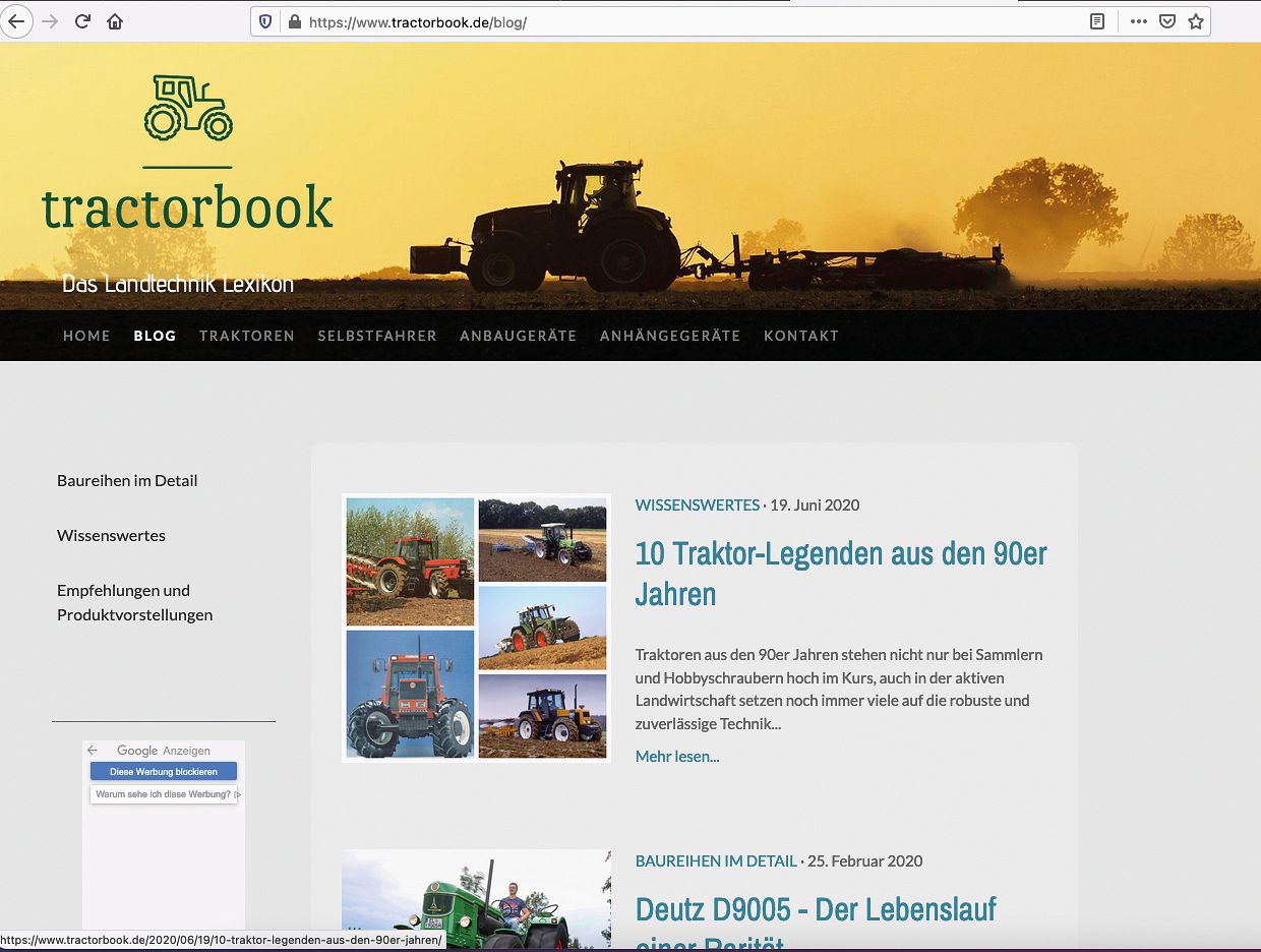 Frederic Bröcker interessiert sich nicht nur für Traktoren allein. Auf der Website tractorbook.de finden sich unzählige technische Daten zu Landmaschinen und Traktoren. Von vielen Herstellern hat er deren Geschichte recherchiert und bietet nebst den technischen Angaben spannendes Hintergrundwissen. Tractorbook.de wurde im Jahr 2020 500'000 mal aufgerufen.