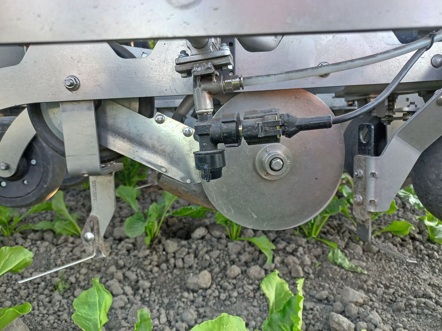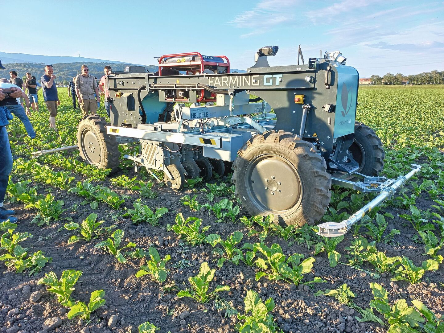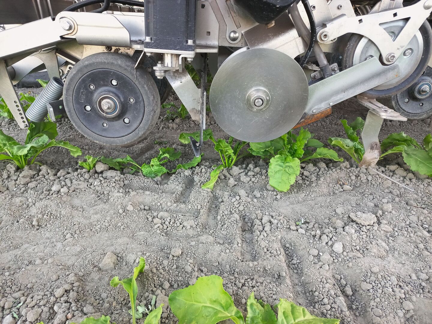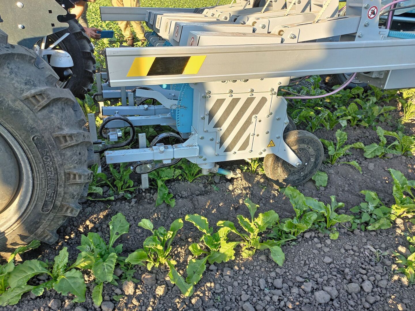 Dank GPS RTK kann der Ablageort der Rübe genau geortet werden. Mittels beweglichem Arm hackt er zwischen den Rüben. Mit 950 m/h hatte der Roboter 3 Tage um 10 ha zu hacken.