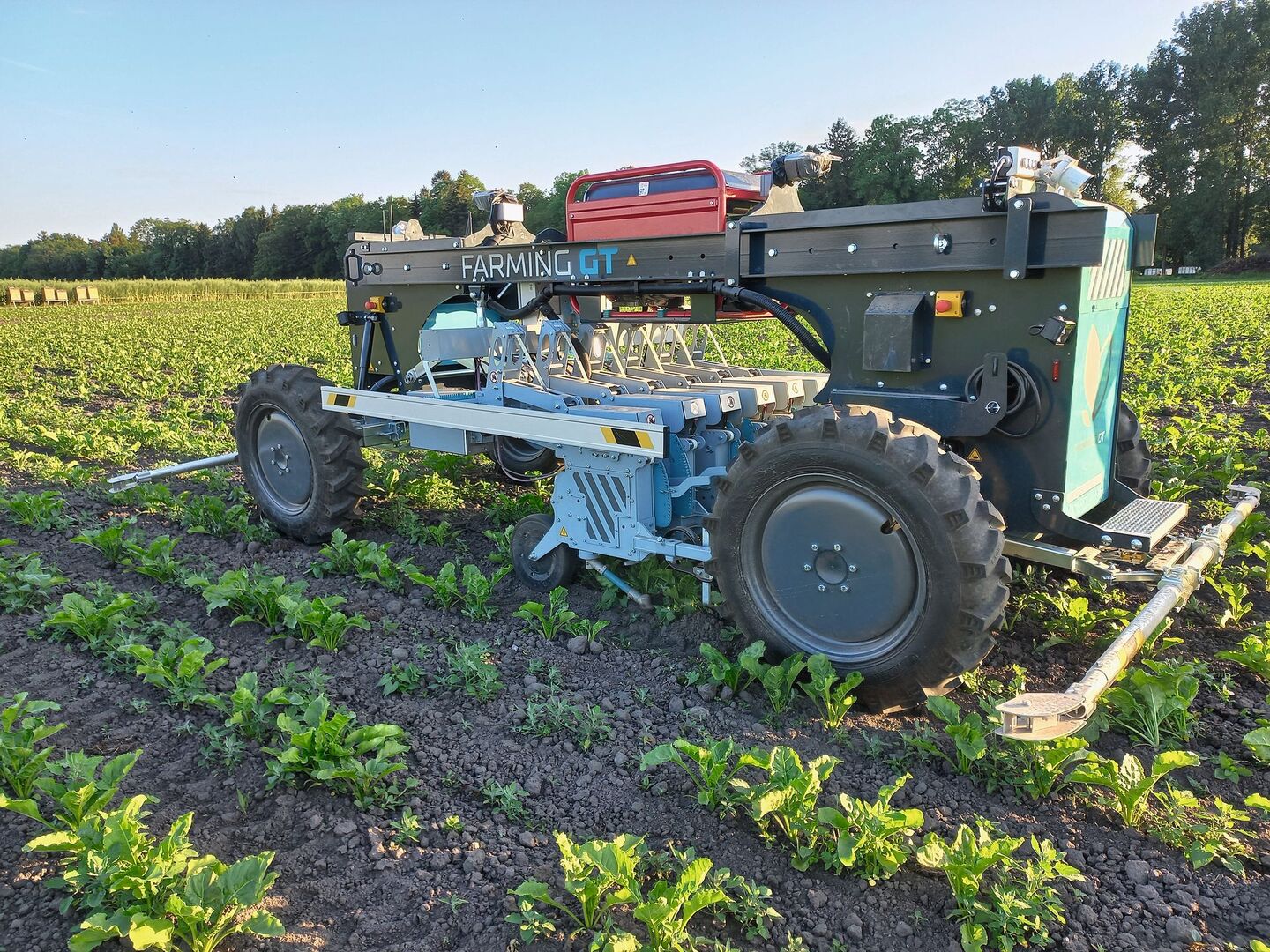 Der Roboter erkennt die Rüben mittels Kamera. Mit dem blauen beweglichen Arm kann in der Reihe zwischen den Rüben das Unkraut rausgefräst werden.