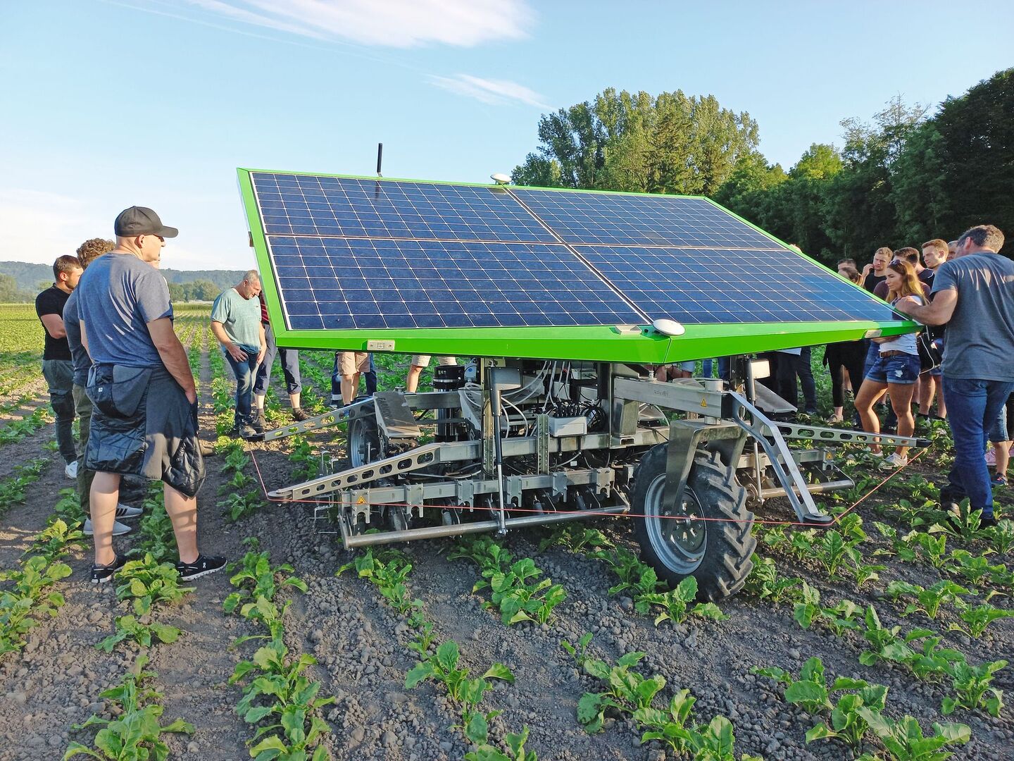 Ausgestattet mit vier Solarpanels und einem Akku kann während 24 Stunden auf 3 m Arbeitsbreite gehackt und gesät werden.