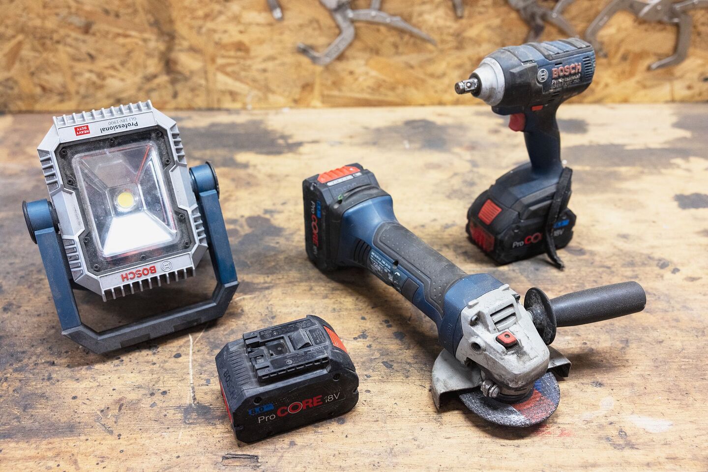 Auf die Frage nach seinen wichtigsten Werkzeugen, reiht Ruedi Schelbert seine Akku-Geräte auf der Werkbank auf. «Dank Akku-Geräten spare ich sehr viel Zeit. Man muss nicht vorgängig eine Kabelrolle installieren, beispielsweise bei einer kleinen Reparatur beim Siloentnahmegerät oder bei einer Halterung bei der Stalleinrichtung, fernab einer Steckdose.»
