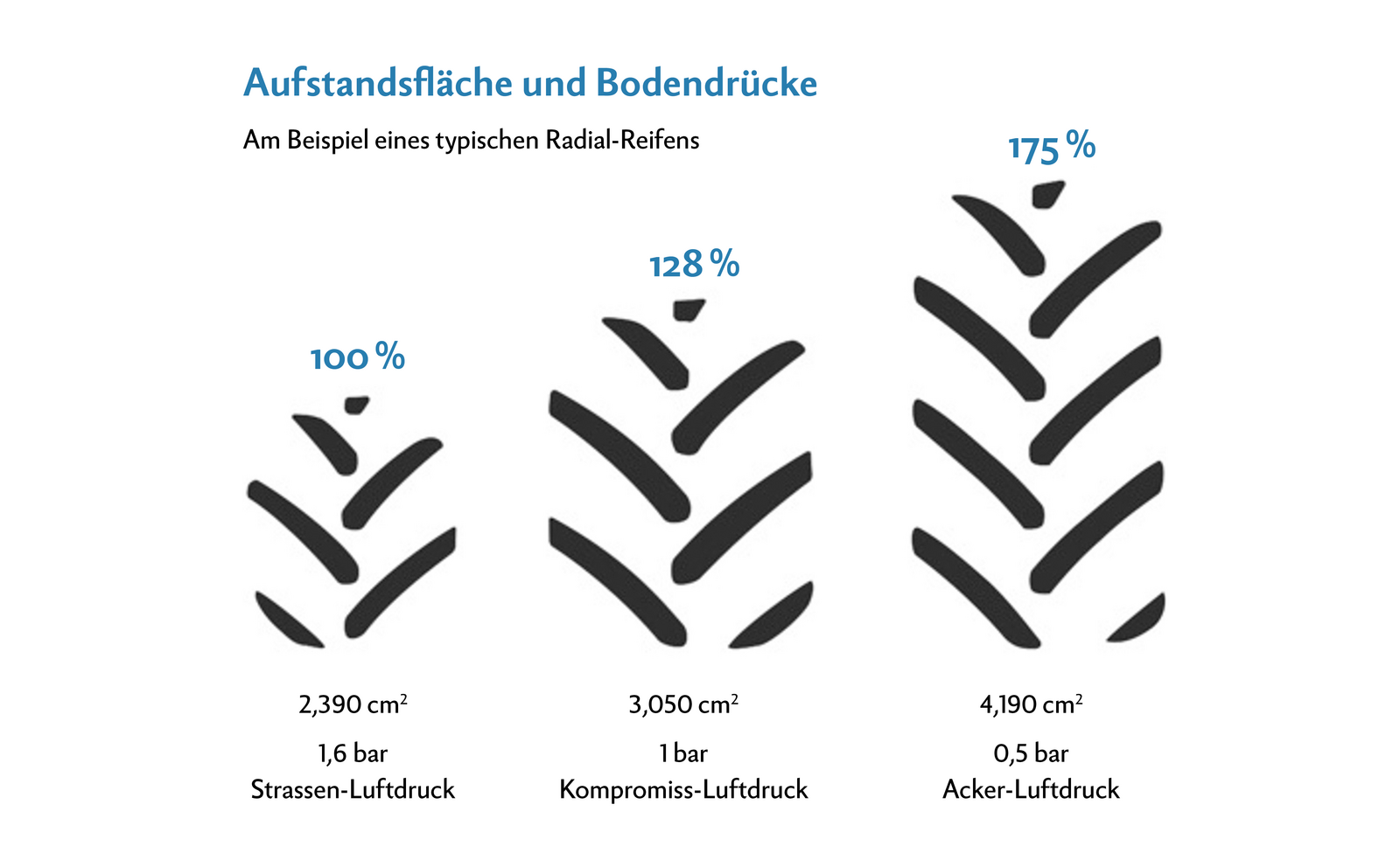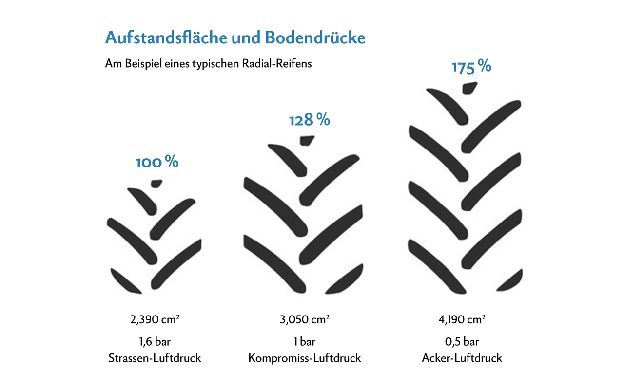 Die Stärke und Bauart eines Reifens zeigt sich nicht nur in seiner Zugkraft, sondern auch anhand seiner Bodenauflagefläche. Je grösser die Kontaktfläche zum Boden ist, desto geringer ist die punktuelle Bodenbelastung des Gewichts. Die beiden Eigenschaften hängen zusammen und es lohnt sich deshalb doppelt, den passenden Reifendruck einzustellen.