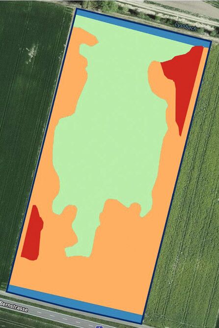 Am Feldtag 2023 wurde das Feld mit diesen Faktoren in Ertragszonen eingeteilt. Die ertragsstarken Zonen sollten mit mehr – und die ertragsschwächeren Zonen mit weniger Saatmenge versorgt werden. [IMG 2]