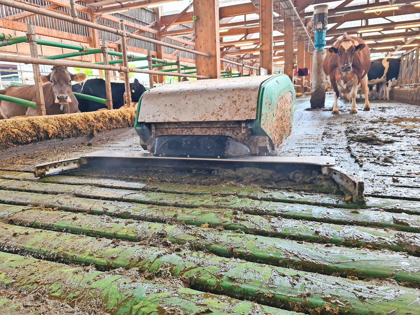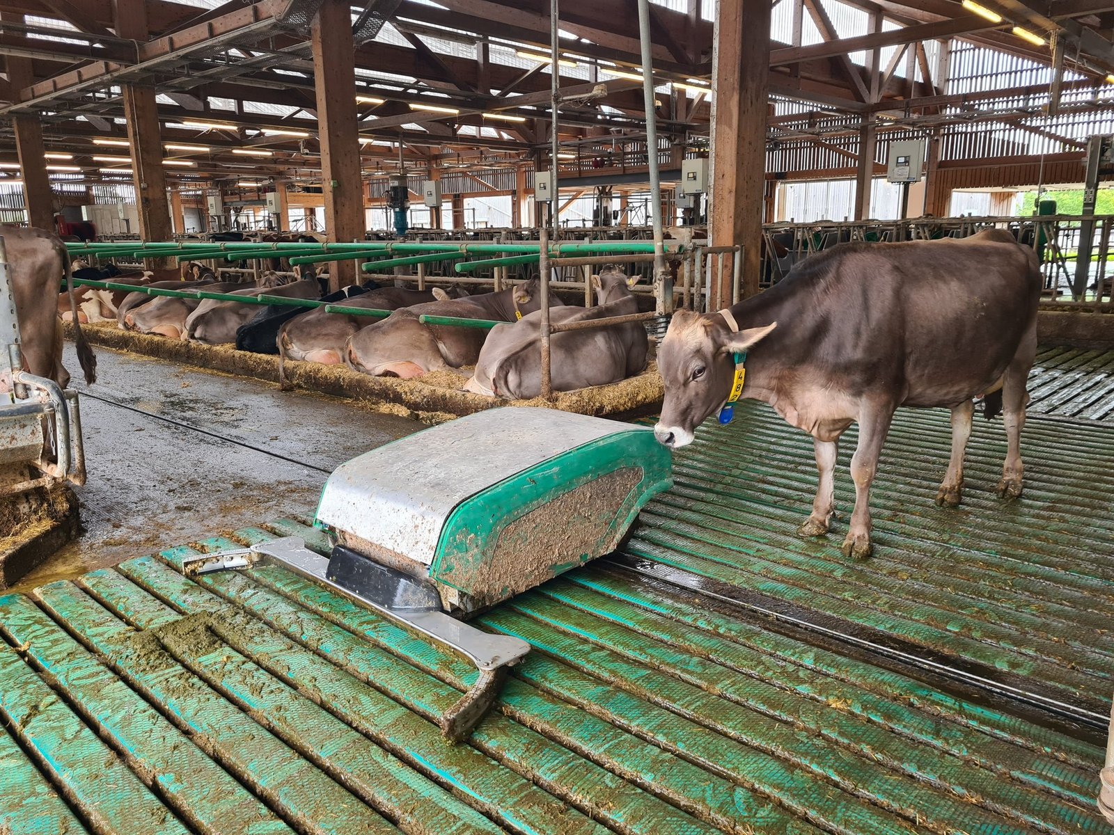 Der Roboter säubert die Quergänge, die der Seilzugschieber nicht erreichen kann. Zudem reinigt er den Spaltenboden am Fressplatz. Direkt am Fressplatz, wo die Kühe stehen, fährt er mittags, wenn sich dort am wenigsten Kühe aufhalten. Ansonsten weichen die Kühe dem Roboter gekonnt aus. Steht eine Kuh an der Tränke, weicht sie zurück, lässt den Roboter vorbei und geht wieder nach vorne.