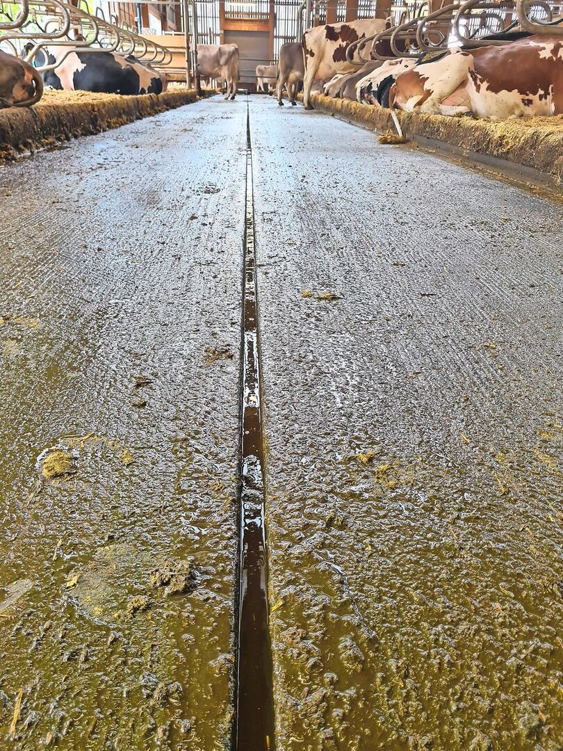 Matthias Schick geht davon aus, dass etwa 80 Prozent aller Entmistungsanlagen so gestaltet sind. Dabei geht es heute nicht mehr nur darum, dass das Entmistungssystem den Boden sauber macht und den Kühen einen guten Stand bietet. Sondern auch darum, die Ammoniakemissionen möglichst gering zu halten.