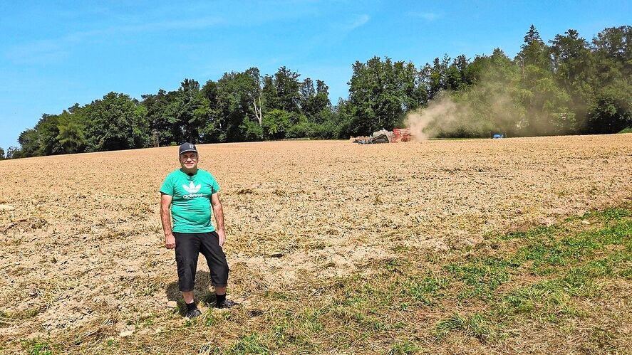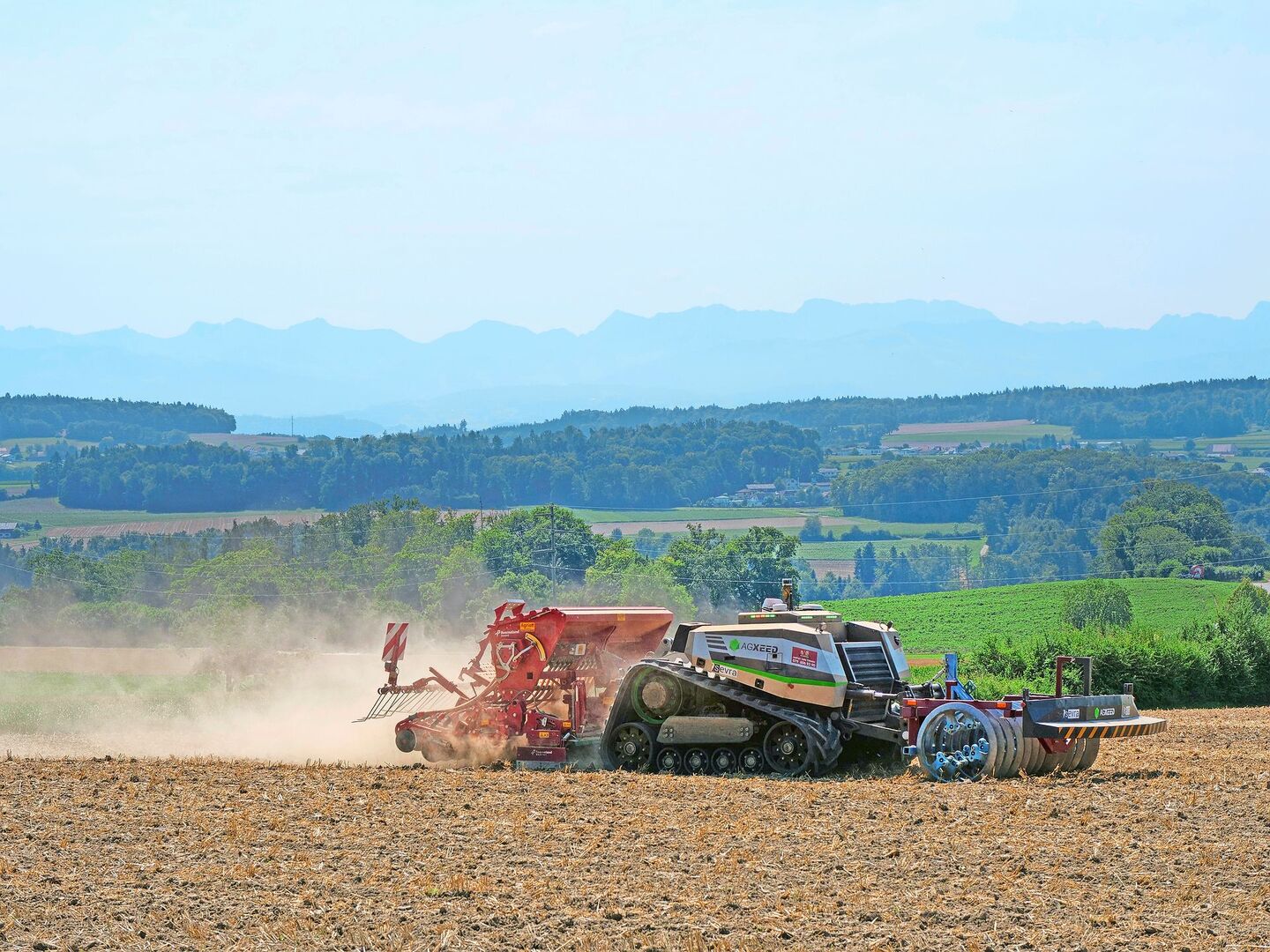 Die Sonne steht schon fast senkrecht am Himmel und die Mittagshitze brennt unentwegt auf das Stoppelfeld. Derweil zieht der Feldroboter von Landwirt Beat Mathys aus Cressier FR unbekümmert seine Runden.