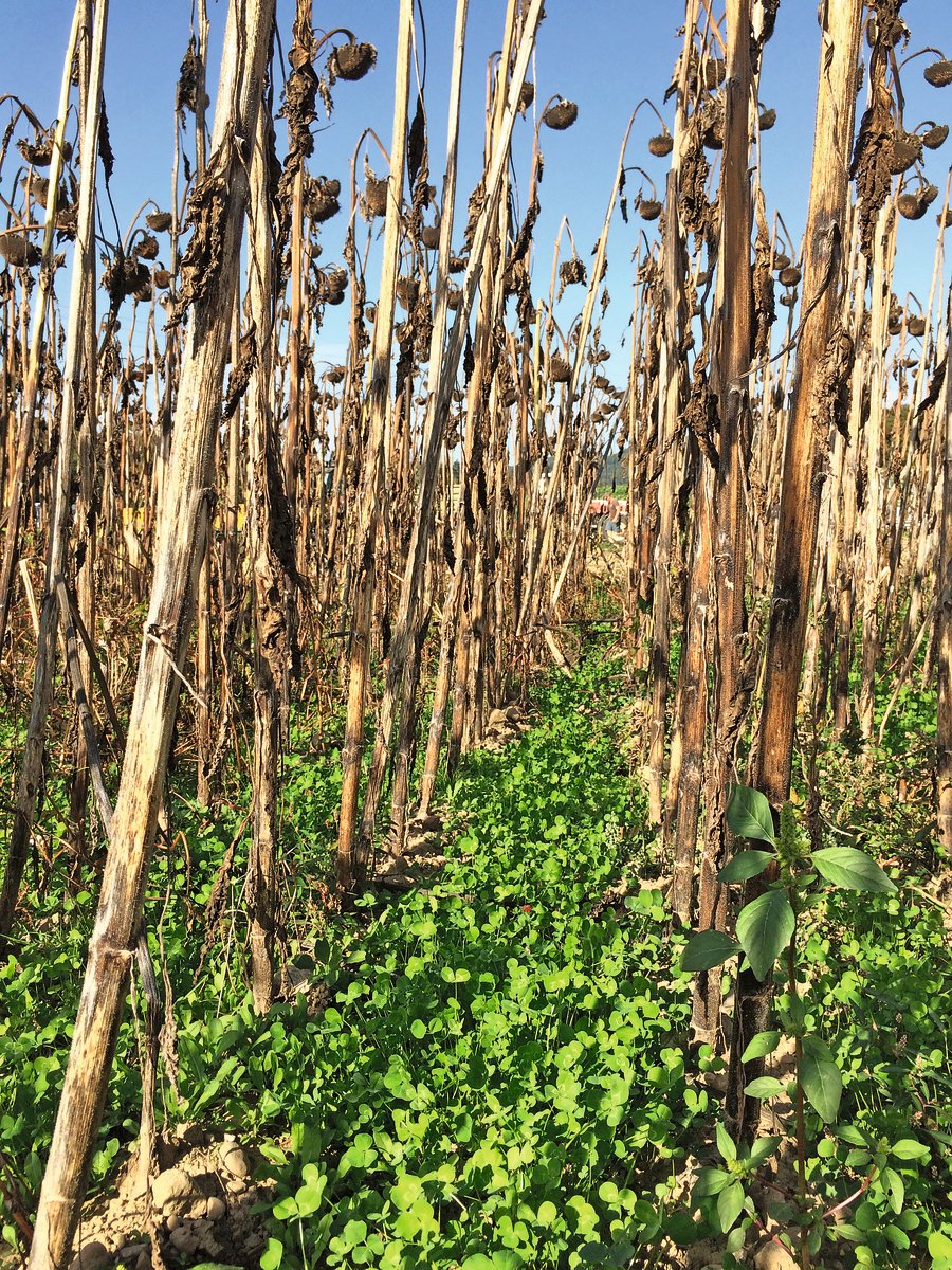 Vor der Saatbettbereitung wartet man, bis die Unkräuter gekeimt haben und eggt sie dann aus. Dieser Vorgang wiederholt man mindestens einmal, bevor die Sonnenblumen im April oder Mai gesät werden. Eine spätere Saat und die wärmeren Temperaturen fördern eine rasche Jugendentwicklung, verzögert aber den Erntetermin. Als Hackfrucht mit grossen Reihenabständen kann das Unkraut gut mechanisch durch Blindstriegeln und Hacken bekämpft werden. Die Untersaat kann gleichzeitig mit den Sonnenblumen oder im letzten Hackdurchgang gesät werden. Trotz des späten Saatzeitpunktes laufen die Untersaatpflanzen gut auf, und konkurrieren die Sonnenblumen nach Reihenschluss weniger.