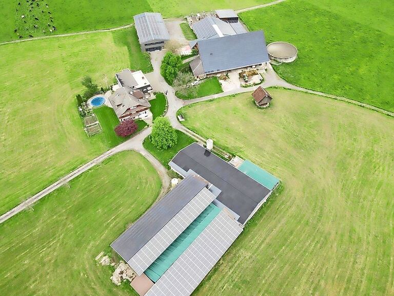 Die grössten Stromverbraucher auf seinem Betrieb sind der Melkroboter, die Wärmepumpe für das Heizen der Wohnungen und die Warmwasser-Erzeugung sowie diverse Lüfter. Pro Jahr benötigt der Betrieb eine Strommenge von rund 80 000 kWh. Lukas Bucher hat die Dächer seines Betriebs mit PV-Anlagen von einer Gesamtleistung von 620 kWp ausgestattet. Der Aufbau der PV-Anlagen erfolgte in Etappen.