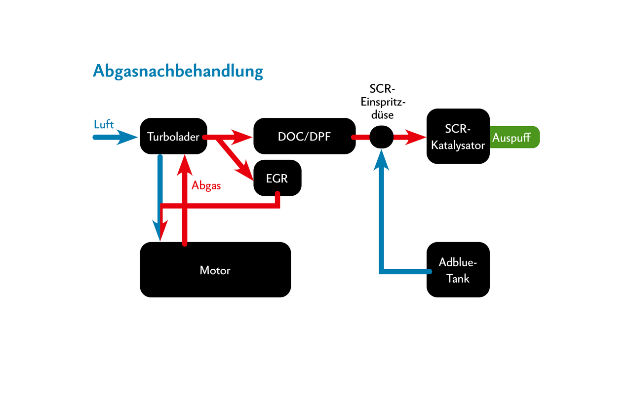 Nachdem der Dieselkraftstoff im Zylinder gezündet wurde, beginnt eine aufwendige Nachbehandlung der entstandenen Abgase.