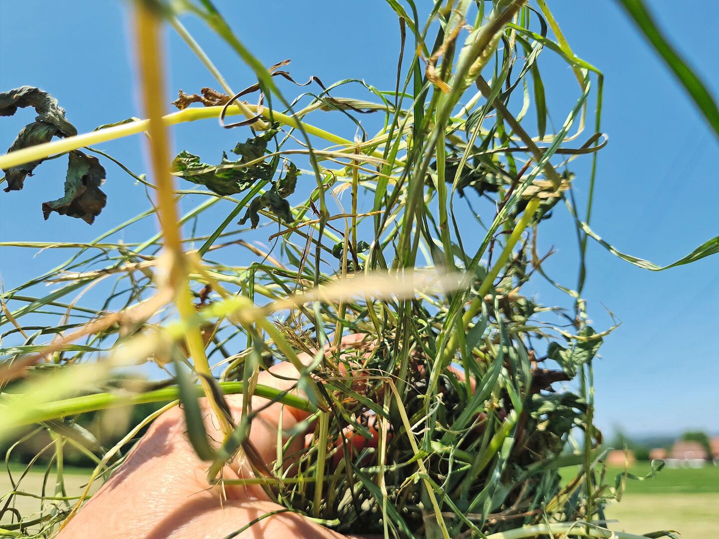 Im Hochsommer ist es wettertechnisch normalerweise leicht möglich, Bodenheu zu produzieren. Das heisst konkret: Das Heu auf dem Feld soweit zu trocknen, dass es beispielsweise zu Ballen gepresst werden kann. Diese lassen sich dann ohne Verluste wie Futtererwärmung und Schimmeldung lagern. Da die Heulager vom ersten Schnitt bereits gut gefüllt sind, kann dort noch Kapazität für die Herbstschnitte freigehalten werden. Die Schnitte dazwischen lassen sich draussen trocknen und die Ballen andernorts einlagern.