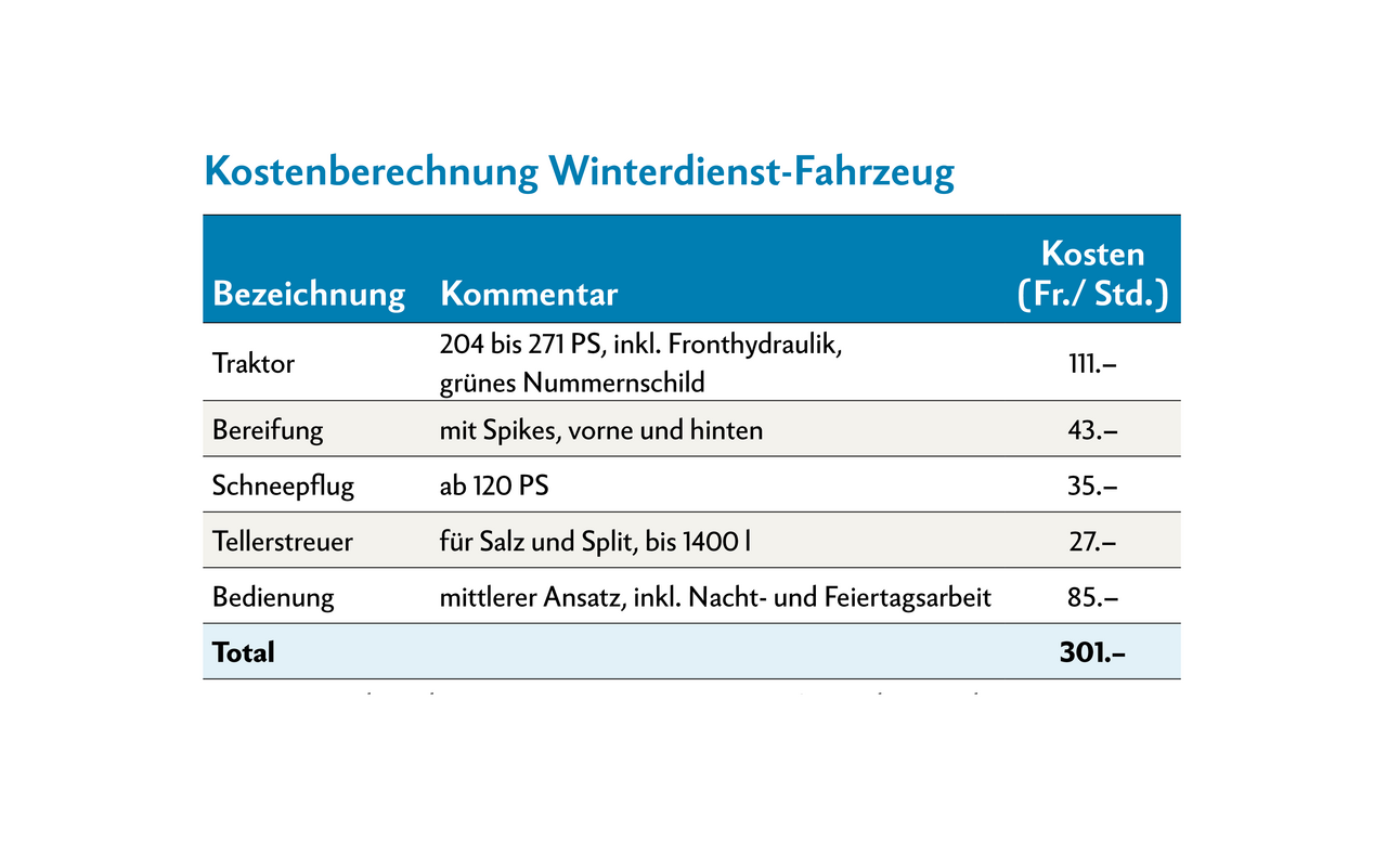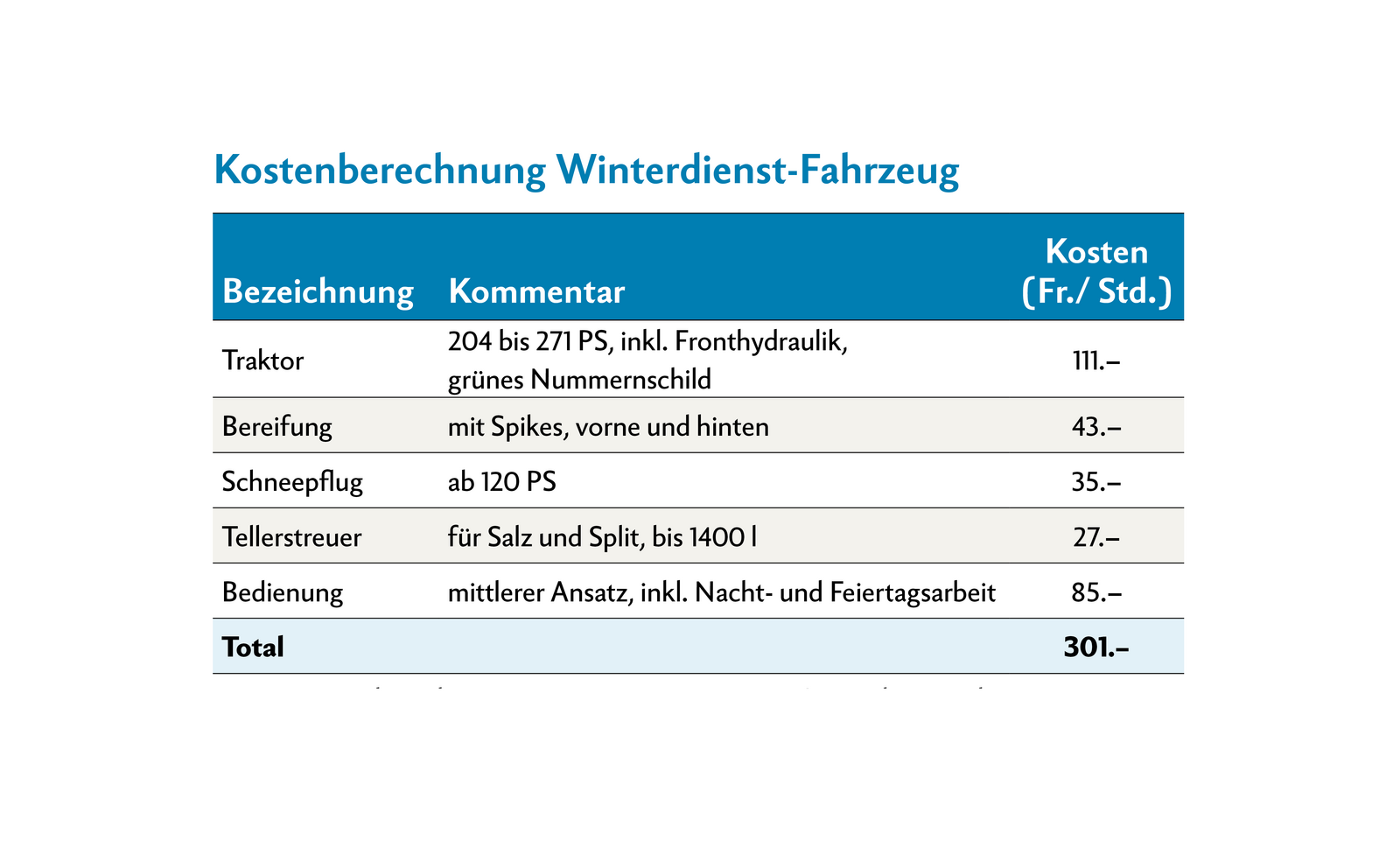 Wird ein leistungsstarker Traktor als Beispiel genommen, der bestens für den Winterdienst ausgestattet ist, entstehen schnell hohe Kosten (siehe Tabelle). Ein Traktor mit ausreichender Leistung, Spikes vorne und hinten, einem Schneepflug sowie einem grossen Tellerstreuer kostet pro Stunde bereits 216 Franken. Hinzu kommen die Kosten für die geleistete Arbeit, die mit 85 Franken veranschlagt werden. [IMG 2]