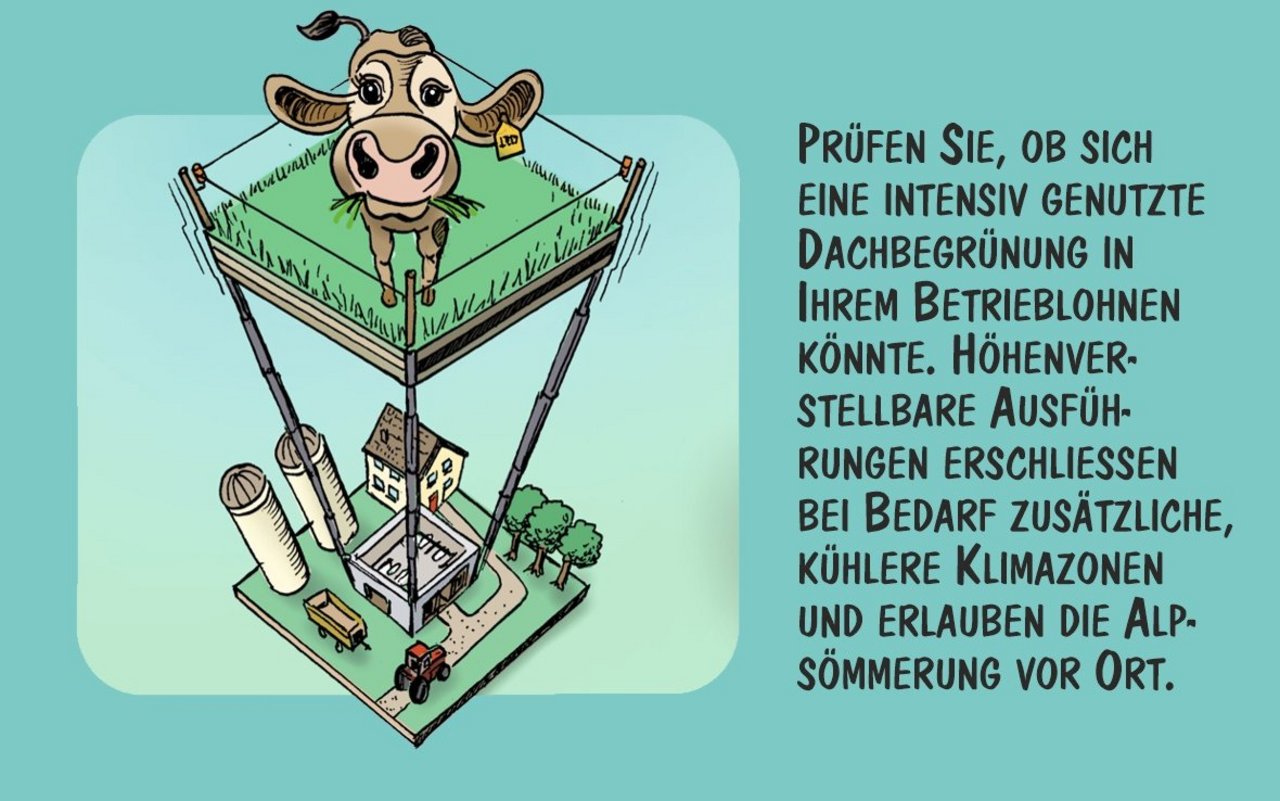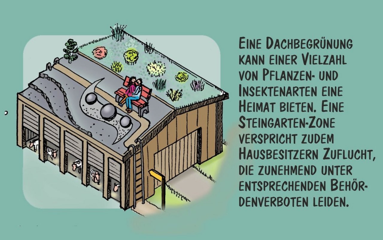 Cartoon von Marco Ratschiller/Karma: Vier Vorschläge für begrünte Stalldächer
