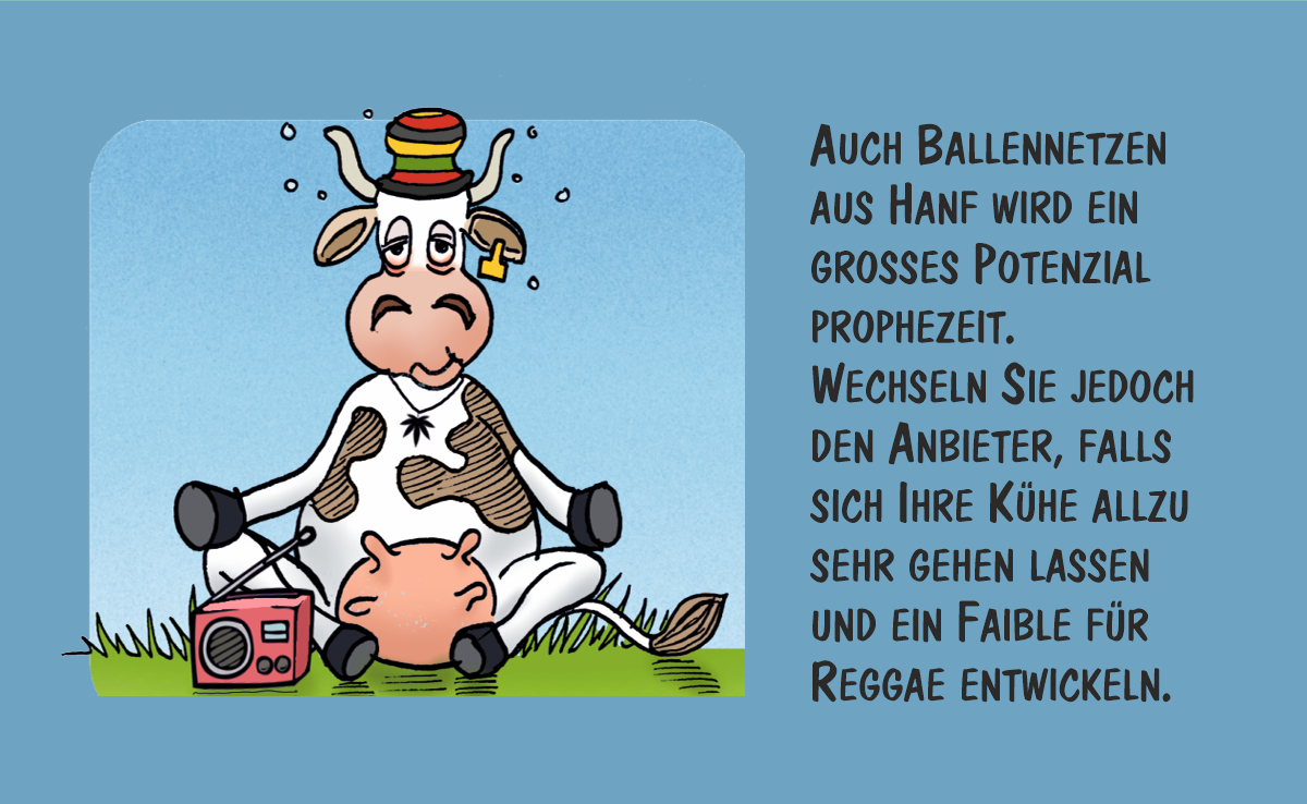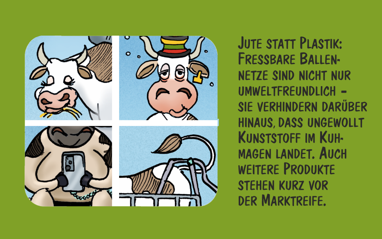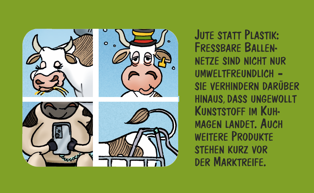 Jute statt Plastik: Fressbare Ballennetze sind nicht nur umweltfreundlich. Sie verhindern darüber hinaus, dass ungewollt Kunststoff im Kuhmagen landet. Auch weitere Produkte stehen kurz vor der Marktreife. Marco Ratschiller/Karma stellt sie vor.