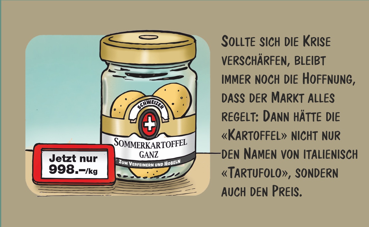 Cartoon von Marco Ratschiller/Karma: Wege aus der Kartoffelkrise