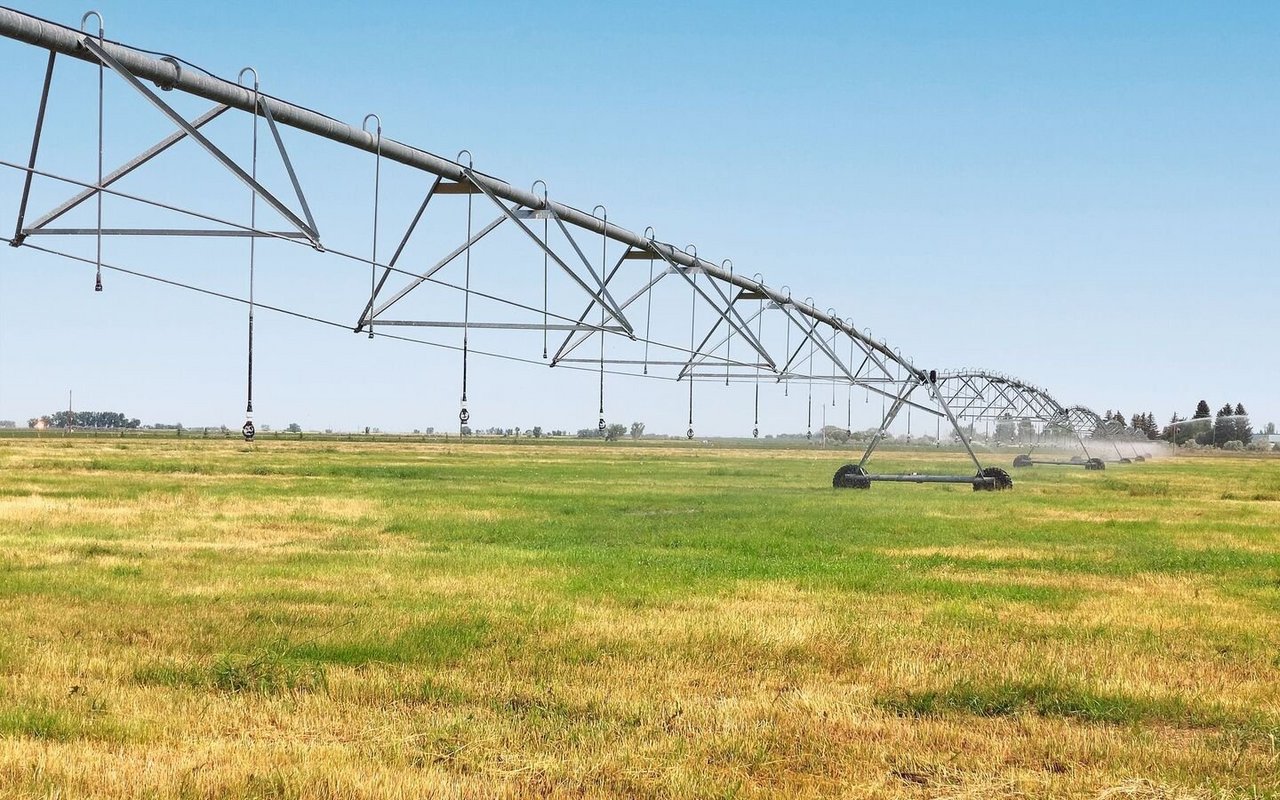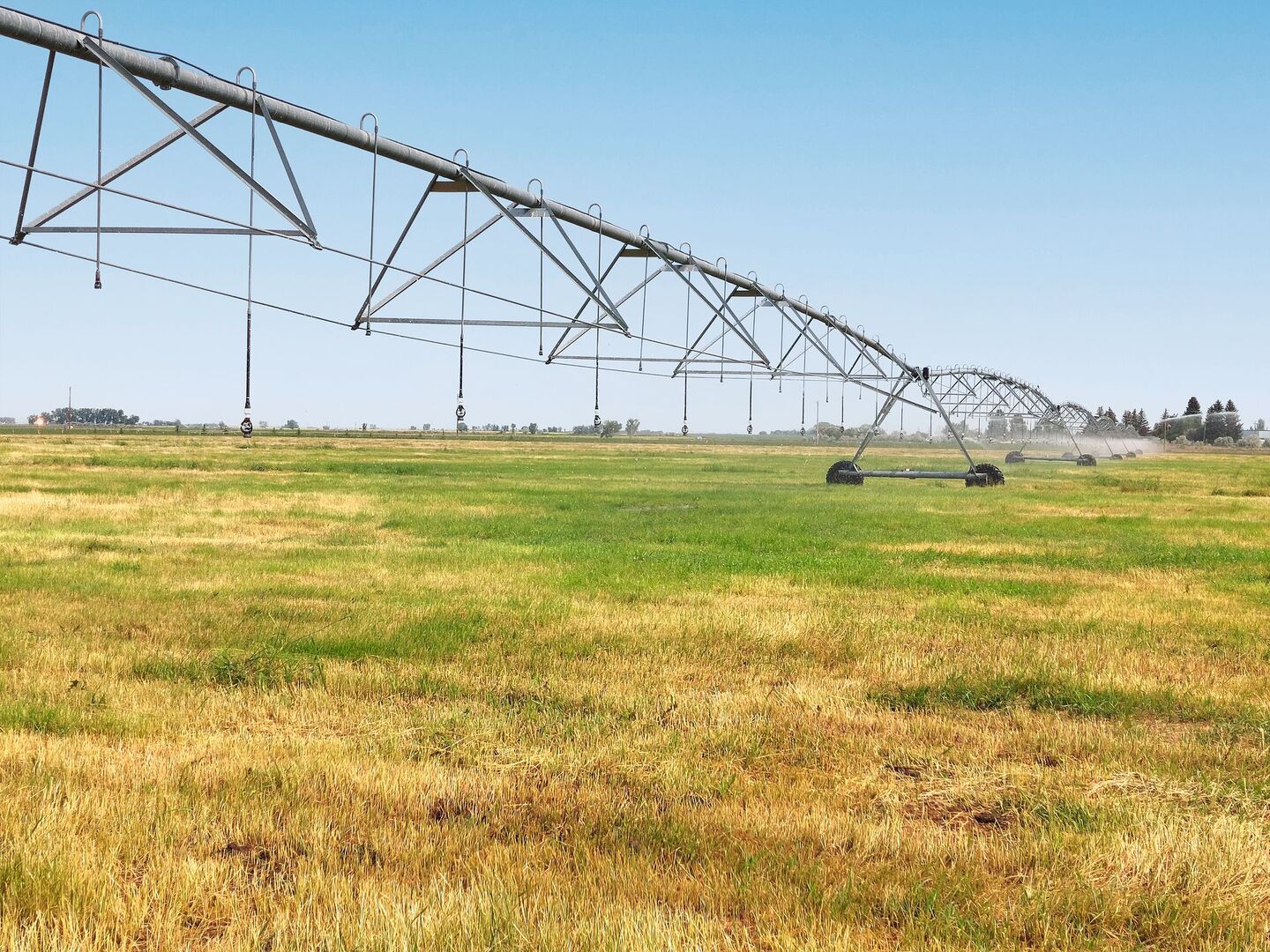 Die Bewässerungsanlagen, sogenannte «Pivit», fahren im Kreis. Eine Runde dauert rund 24 Stunden und eine Anlage kann 64 Hektaren bewässern. Die Anlage kann vom Handy aus gestartet werden.