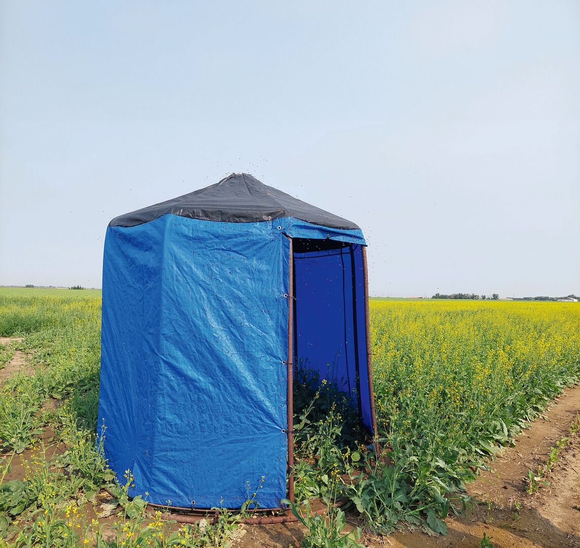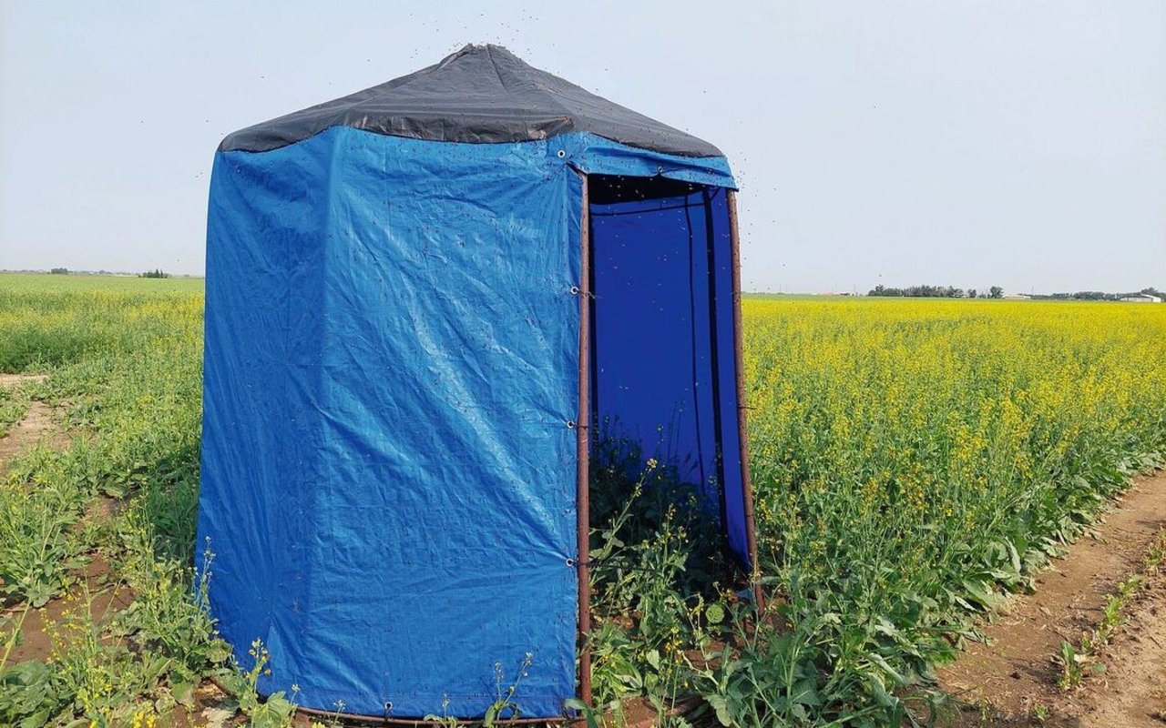 In Kanada leben kaum natürliche Bienen, da die Winter mit bis zu minus 40 Grad zu kalt sind. Deshalb werden Bienen aus Australien importiert und in diesen Zelten aufs Feld gebracht.