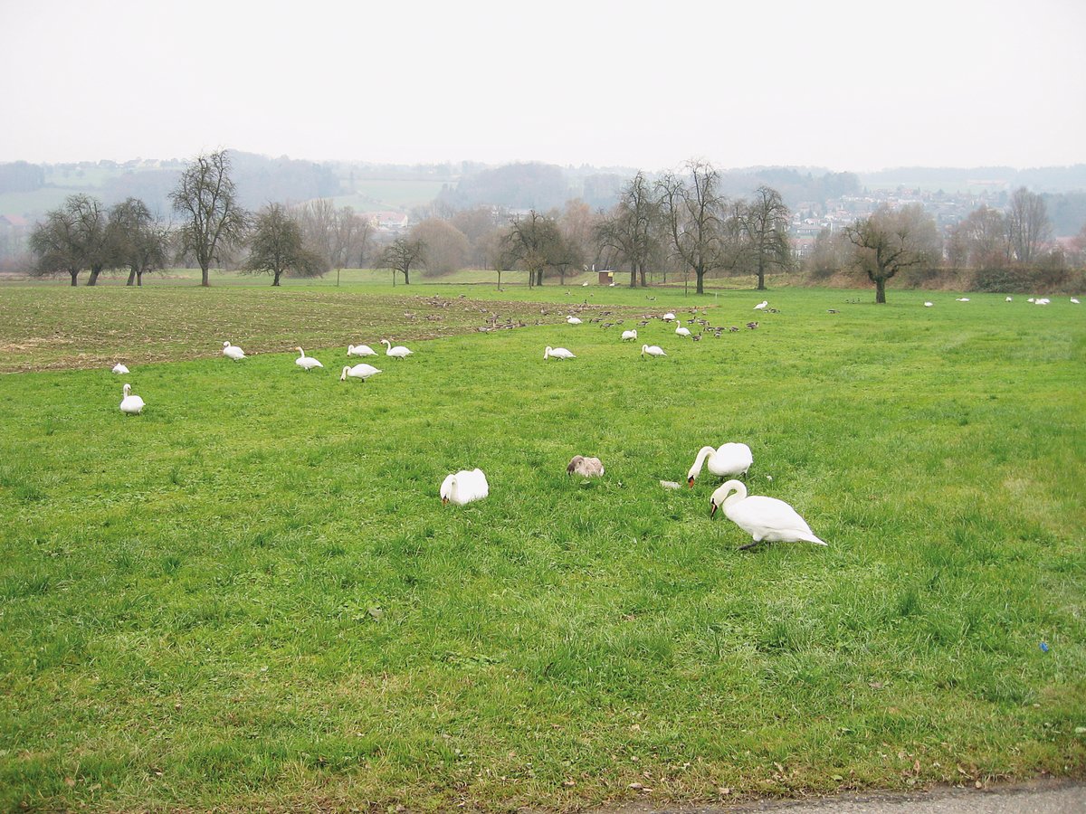 - In Gewässernähe verschmutzen grosse Gruppen von Höckerschwänen das Futtergras.
