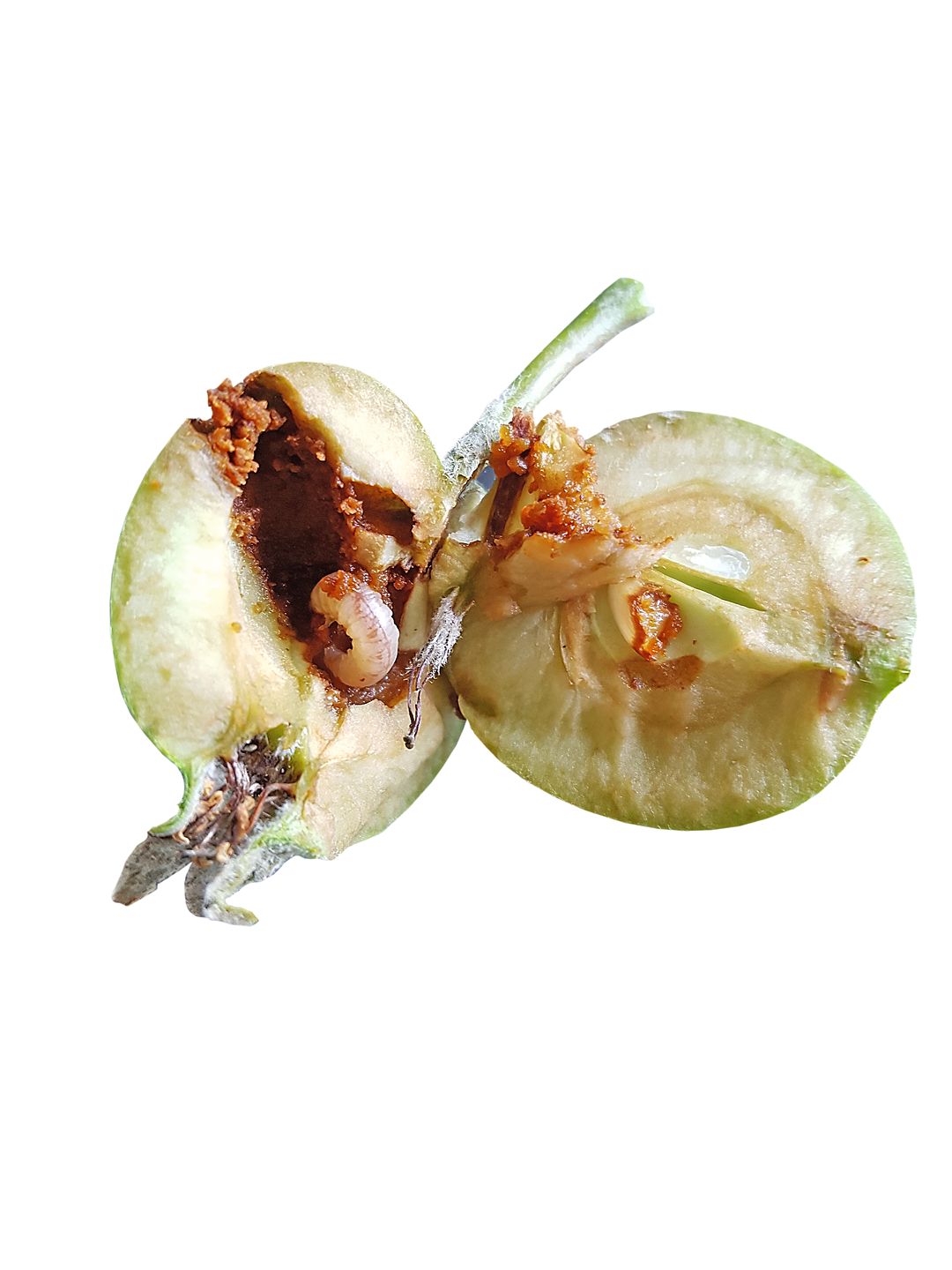 Die Raupe des Apfelwicklers, welche auch als «Obstmade» bezeichnet wird, befällt nicht nur Äpfel, sondern gelegentlich auch Birnen, Quitten, Aprikosen und sogar Baumnüsse. Die Kerne sind ihre Lieblingsnahrung. Im Bohrloch sind braune, feuchte, klebrige Kotkrümel sichtbar.