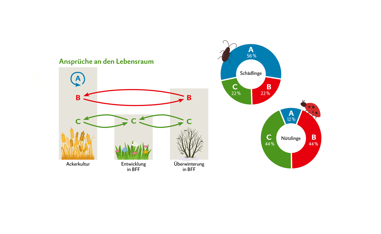 Nützlinge sind im Gegensatz zu den meisten Schädlingen sehr anspruchsvoll, was der Lebensraum, also die ökologische Infrastruktur, betrifft (siehe Grafik oben). «Deshalb wird trotz der Vorkommnis von Nützlingen oft die Bekämpfungsschwelle erreicht und der Einsatz von Insektiziden ist nötig, um grössere Ertragsausfälle zu vermeiden», erklärt Stefan Lutter.