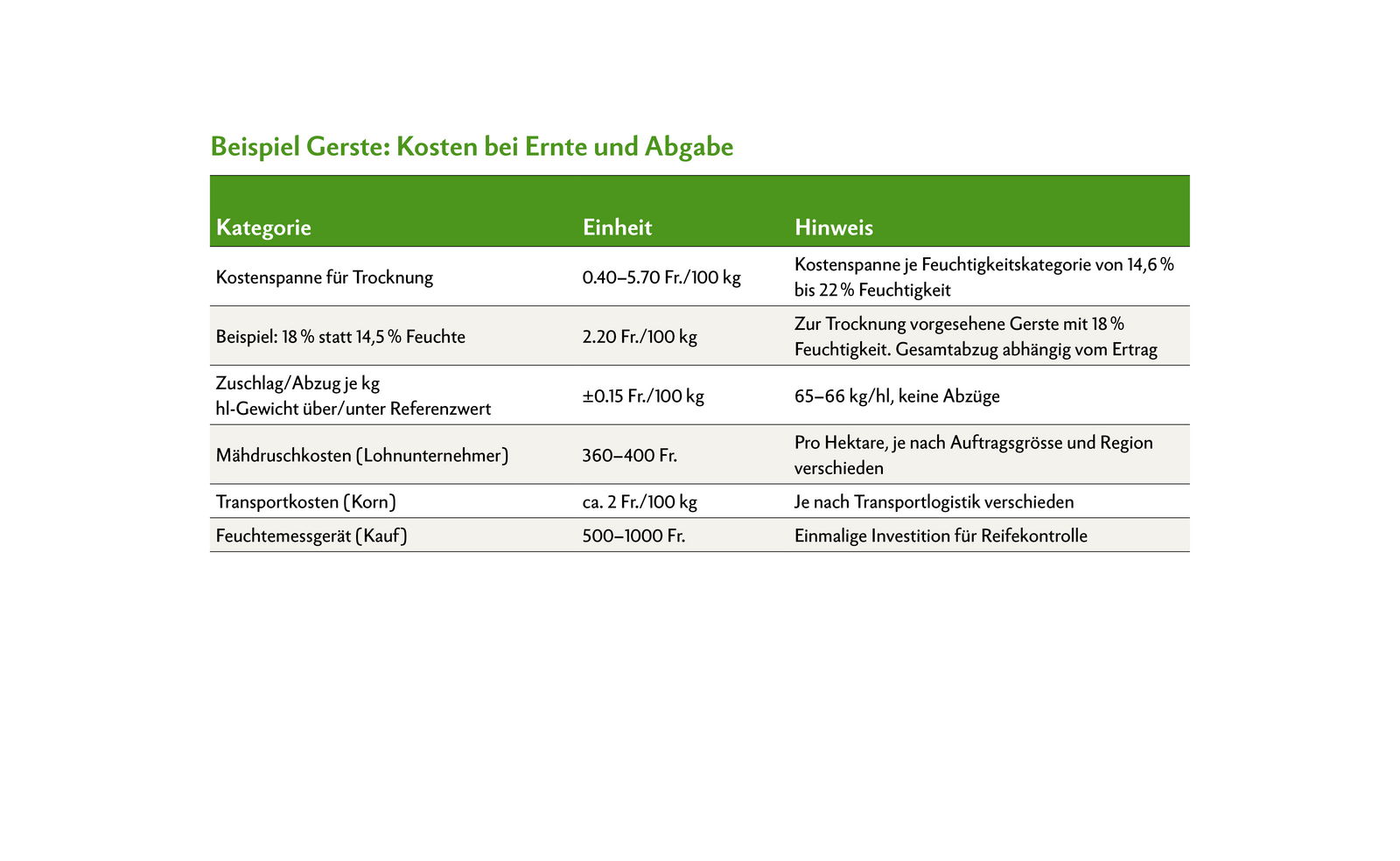 Ein Prozent mehr Feuchtigkeit über dem Schwellenwert verursacht bei der Trocknung fünfmal höhere Kosten als der Abzug für ein zu niedriges Hektolitergewicht. Um 0.75 Fr./100 kg Trocknungskosten auszugleichen für 1 % zu viel Feuchte, müsste das hl-Gewicht mehr als 70 kg/hl erreichen. (siehe Tabelle.)