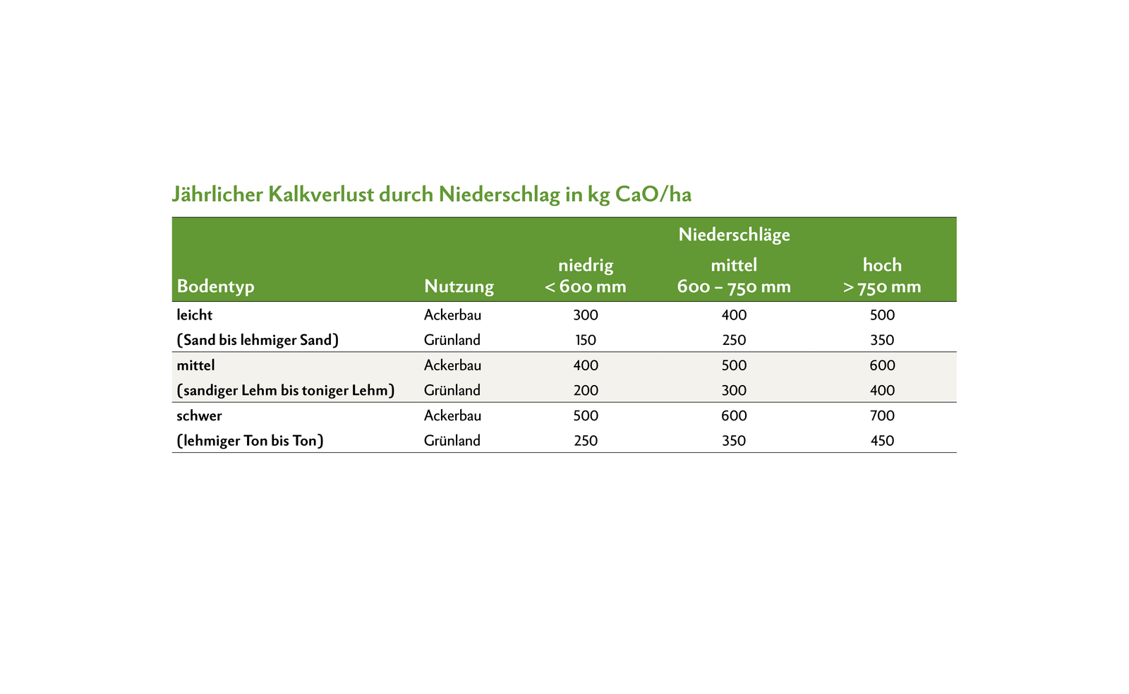 Gemäss der Tabelle «Jährlicher Kalkverlust» gehen jährlich je nach Bodenart, Nutzungsform und Niederschlagsmenge erhebliche Mengen an Kalk verloren. Deshalb sollten Kalkverluste regelmässig kompensiert werden.