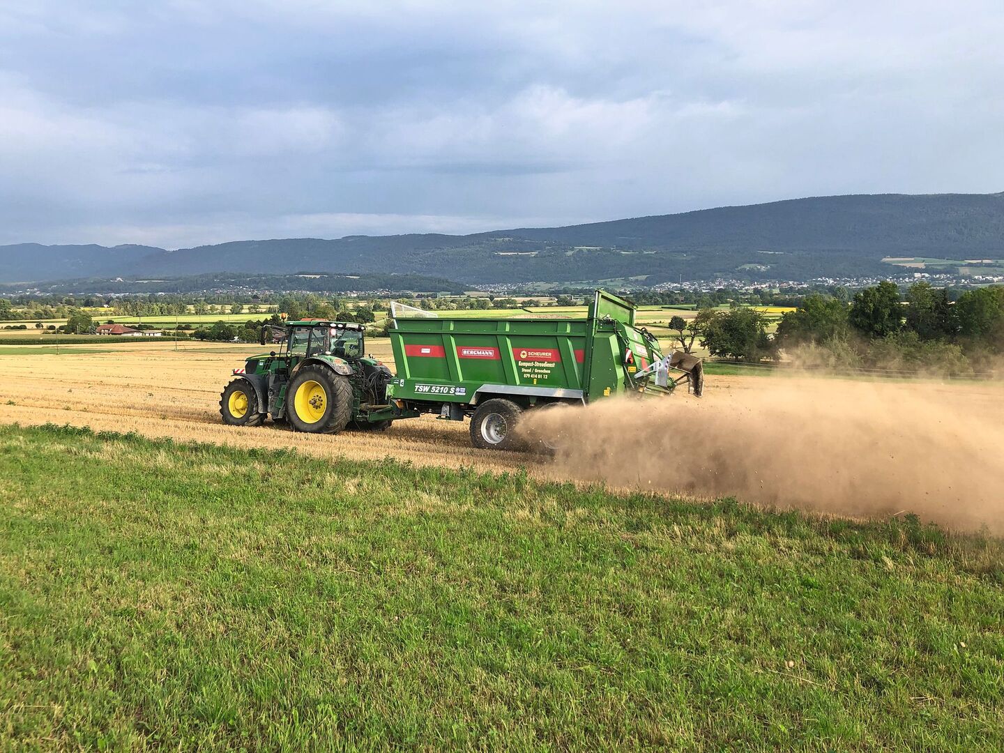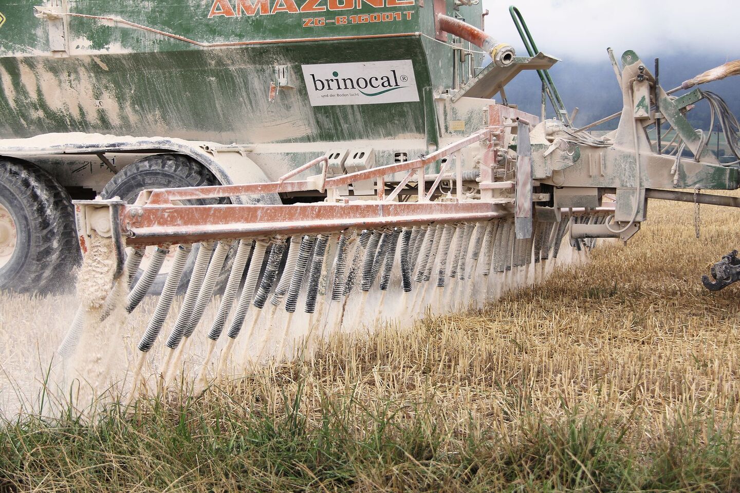 Auf Grünland kann der Kalk nach dem Schnitt ausgebracht und muss nicht zwingend eingearbeitet werden. Er wird durch den Regen eingewaschen. Die Kalkgabe kann vor oder auch nach der Gülleausbringung stattfinden. Marcel Schenk hat auch einige Kunden, die den Kalk sogar im Gülleloch mit der Gülle mischen und so zusammen aufs Feld bringen. Hier dürfen die Mengen nicht zu gross sein, damit sich der Kalk gut in der Gülle löst und nicht absetzt.