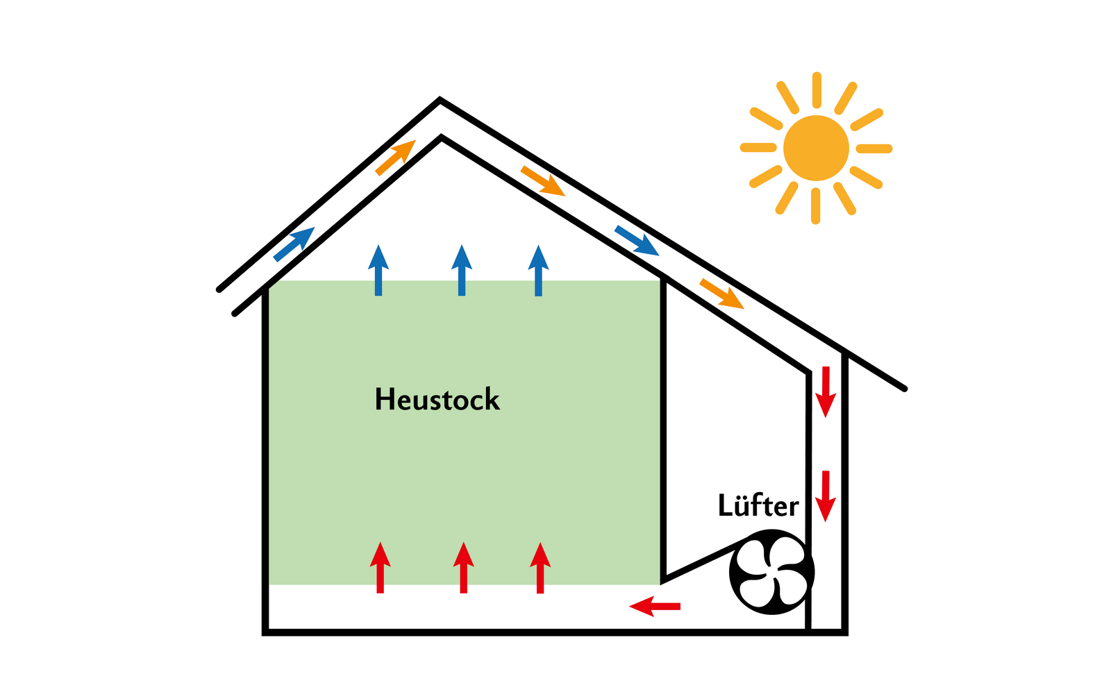 Unter dem Blechdach wird mit OSB-Platten ein Unterdach konstruiert. Somit entsteht ein Unterdachkanal, in welchem die Luft über das Dach erwärmt wird. Diese warme Luft wird vom Lüfter angesaugt und in den Heuraum geblasen.