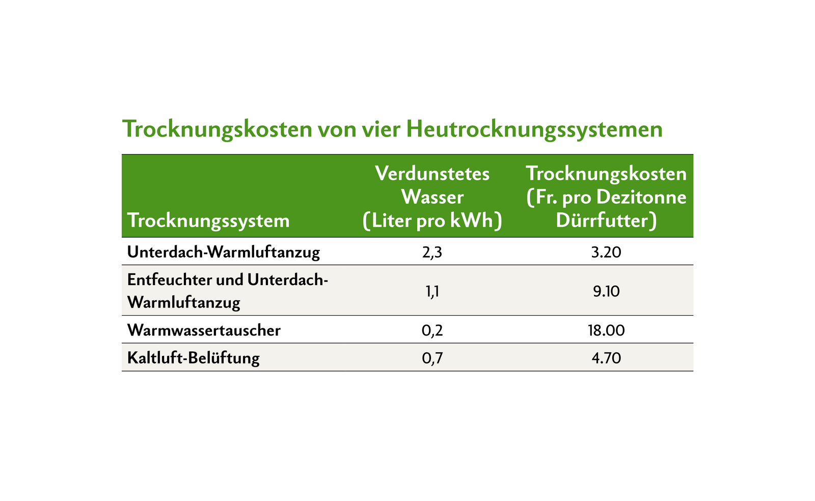 In der Tabelle «Trocknungskosten von vier Heutrocknungssystemen» werden die Trocknungsanlagen in Bezug auf den Energieverbrauch pro Liter verdunstetes Wasser miteinander verglichen. Dabei ist der Unterdach-Warmluftanzug die effizienteste Variante mit über zwei Litern verdunstetes Wasser pro Kilowattstunde. Auch preislich ist diese Variante am günstigsten, weil ausser dem Strom für den Lüfter (Ventilator) keine zusätzlichen Energiekosten entstehen. Die Sonne wärmt gratis.