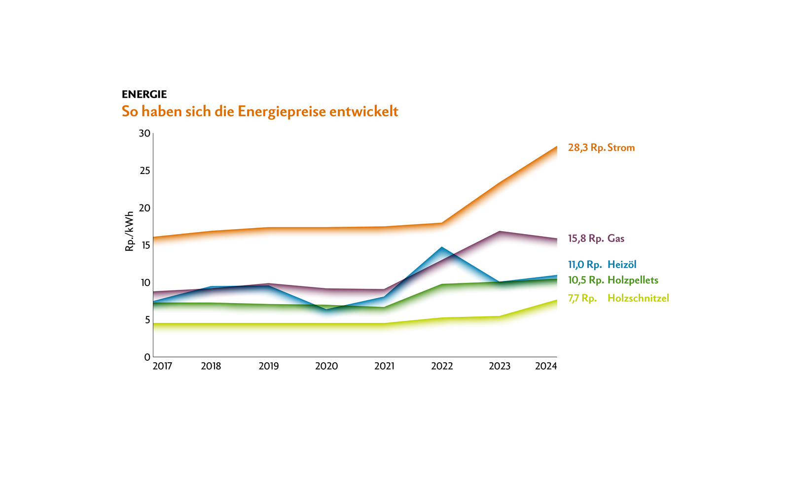 «Strom ist die teuerste Energiequelle und wird in Zukunft noch teurer werden», mahnt Aeby. Der Strompreis hat sich gemäss den jährlichen Erhebungen von Pierre Aeby in den letzten zehn Jahren fast verdoppelt. Heruntergerechnet auf die Kilowattstunde ist Strom im Moment fast dreimal teurer als Holzpellets und viermal teurer als Holzschnitzel.