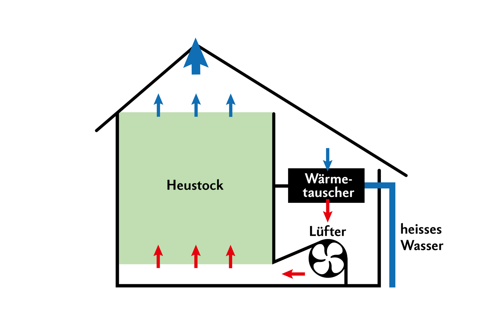 Deshalb müsse die Wärmeleistung mit der Heustockgrösse zusammenpassen. Als Richtwert gilt: Für einen Heustock mit einer Grundfläche von 100 m2 braucht es eine Wärmeanlage mit mindestens 120 kW Leistung oder sogar 150 kW.