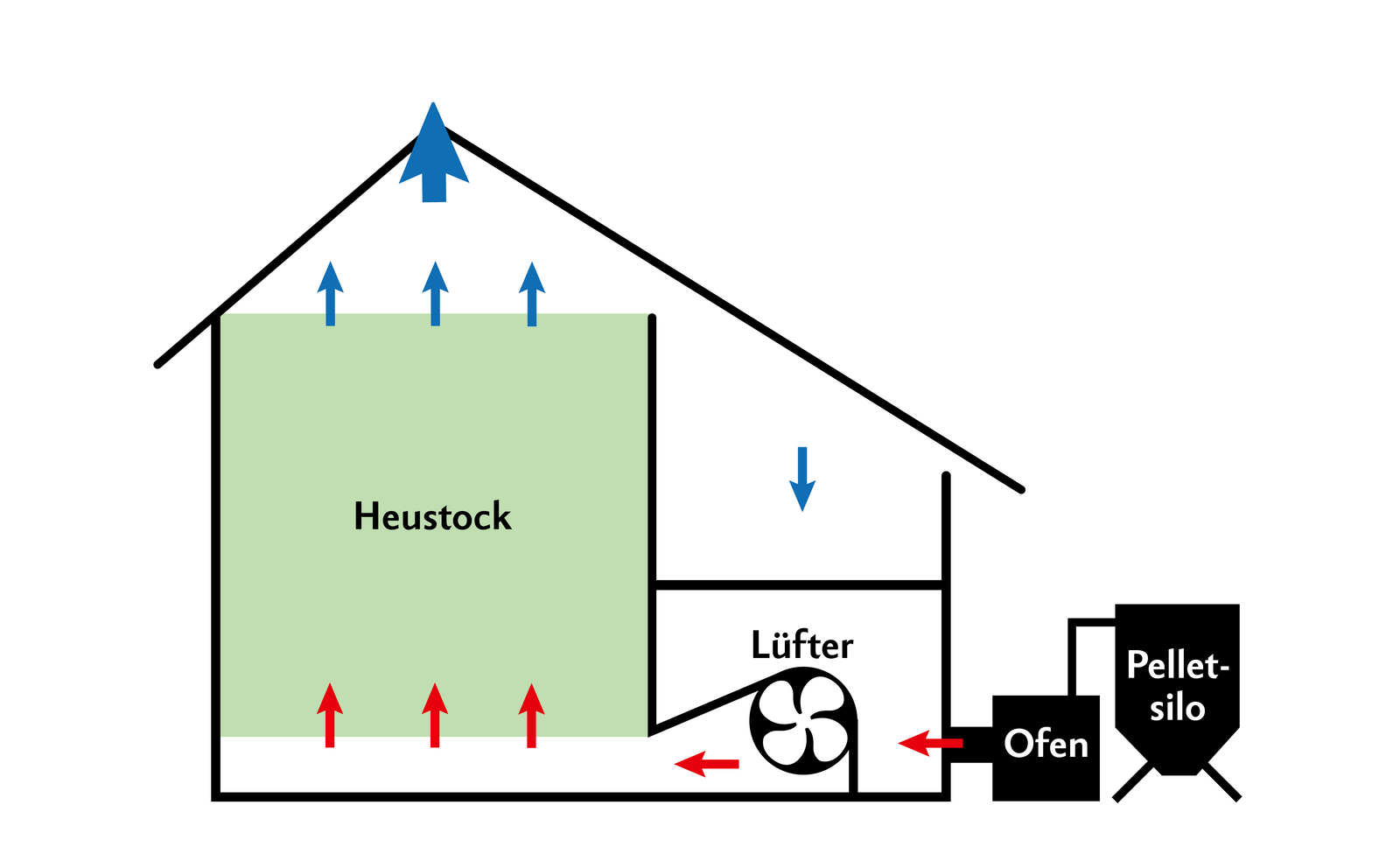 - Warmluft mit Pelletheizung (Heustock-Grundfläche 150 m2)