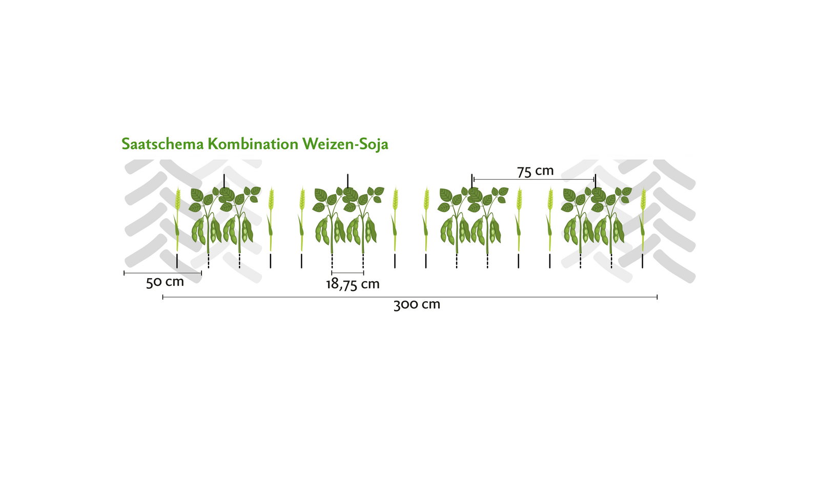 Bei der Kombination Weizen-Soja wurde am 2. Mai Soja zwischen die Weizenreihen gesät (siehe Schema). In der Reinkultur Soja liegt die empfohlene Saatmenge bei 60 Körnern/m2. Für die Staffelkultur wählte Reto Minder 40 Körner/m2 für die Hälfte der Fläche (8 anstatt 16 Reihen), wodurch die Saatstärke pro Hektare insgesamt etwas höher liegt.