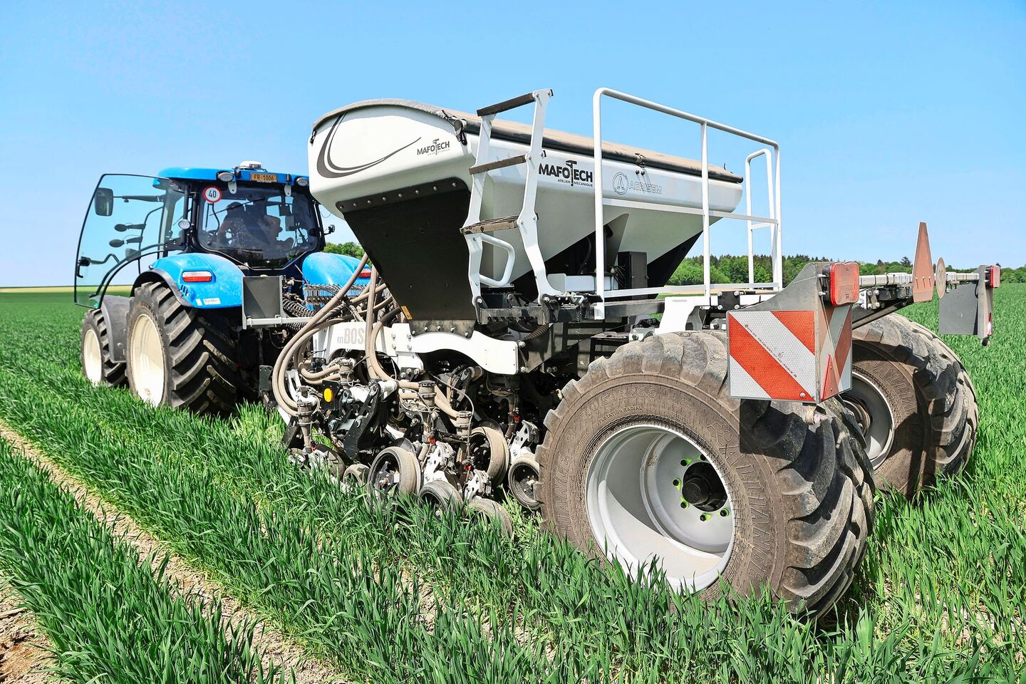 Mittels Direktsaat wurden nach vier Reihen Zuckerrüben jeweils zwei Reihen Körnermais gesät. Der Mais hat dank der hohen Bodentemperatur bereits fünf Tage nach der Saat gekeimt. Im Staffelkulturanbau ist die Düngung etwas anspruchsvoller, gerade wenn zwei Kulturen mit stark unterschiedlichen Düngungsanforderungen auf der Parzelle stehen, wie Körnermais und Zuckerrüben.