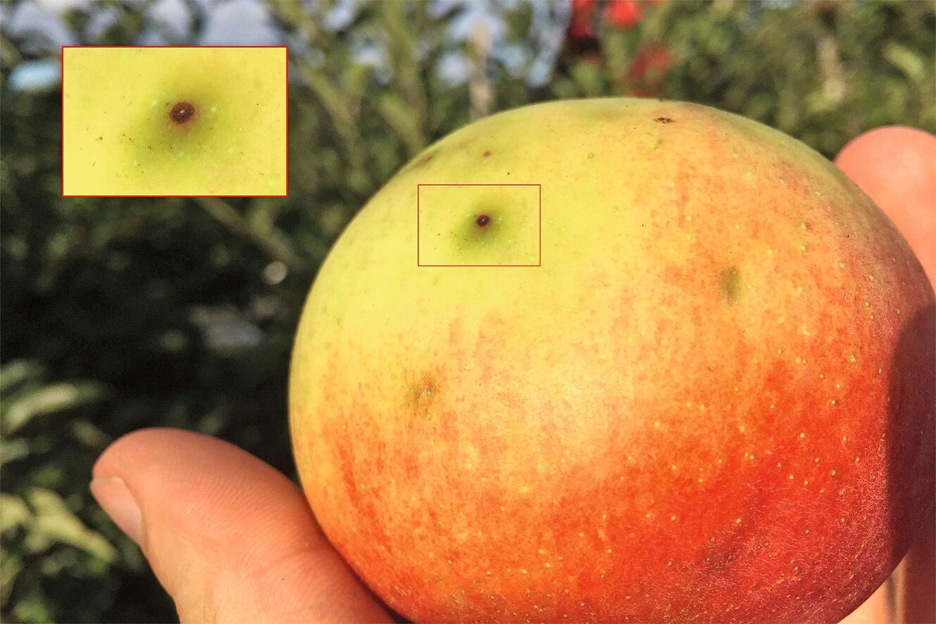 In den Gebieten rund um den Bielersee und im Kanton Zürich beobachteten im Herbst 2023 Apfelproduzenten teilweise massiven Befall durch Mittelmeerfruchtfliegen. Dieser kann auf den ersten Blick mit Stippe oder einem Hagelschaden verwechselt werden. Beim Aufschneiden der Früchte wird jedoch das verzweigte Gangsystem oder bereits matschiges Gewebe unter dem Einstich sichtbar.