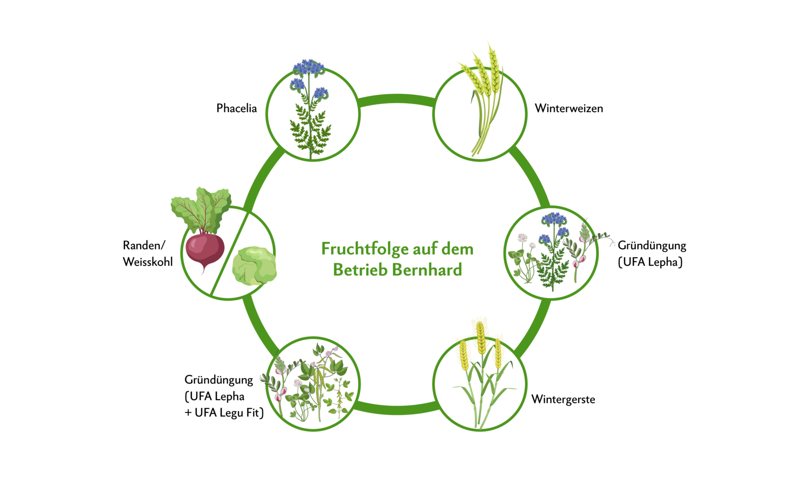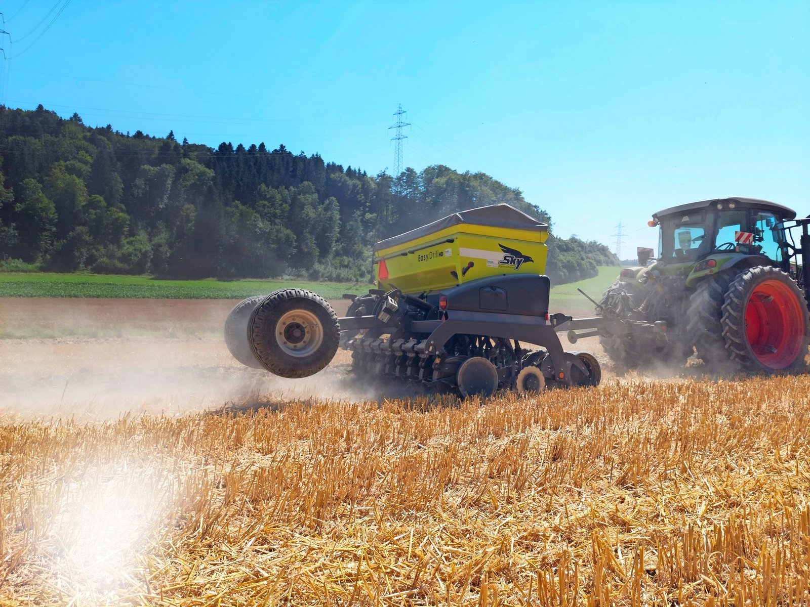 Auf dem Betrieb wird Winterweizen, Wintergerste, Weisskohl und Randen angebaut (siehe Abbildung Fruchtfolge). Immer nach der Winterweizen- und der Wintergerstenernte wird eine Gründüngung gesät. Simon Bernhard verliert keine Zeit und sät die Gründüngung wenn möglich unmittelbar nach der Strohernte mittels Direktsaat ein. Dazu mietet er beim Nachbarn die Direktsämaschine Easy-Drill der französischen Firma Sky Agriculture.