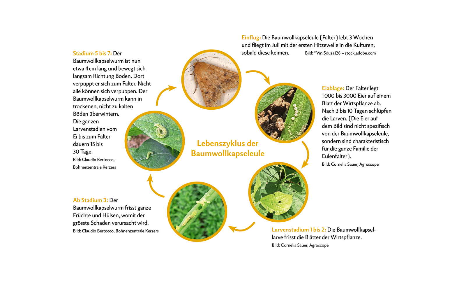 In der Schweiz betrifft der Schädling vor allem die Gemüse-, Mais- und Kichererbsenproduzenten. Er befällt besonders Tomaten, Peperoni, Süssmais, Krautstiel, Erbsen, Salate, Kichererbsen und Bohnen. «Grundsätzlich sind fast alle Gemüsesorten während der gefrässigen Periode des Baumwollkapselwurms betroffen», erzählt Claudio Bertocco, Feldbesichtiger der Bohnenzentrale Kerzers.