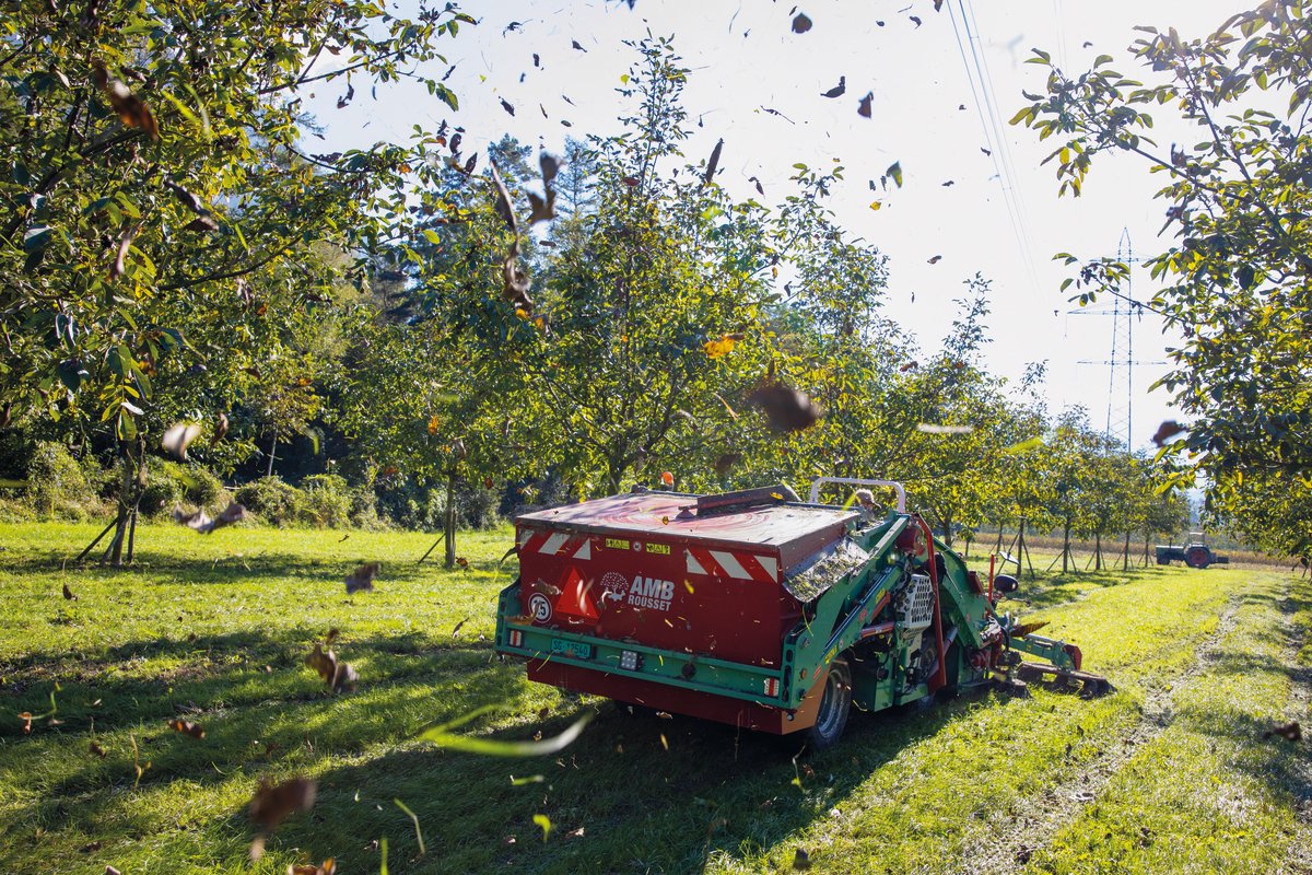 Es ist ein schöner Herbsttag. Heinz Müller fährt mit einer modernen Nuss-Erntemaschine durch die Baumreihen seiner Walnussbaum-Anlage in Weite. Das Fahrzeug gehört der Nugewa. Sie hat es im Jahr 2018 bei der Firma AMB Rousset in Grenoble gekauft. Dort werden Walnussbäume in grossem Stil angebaut und geerntet.