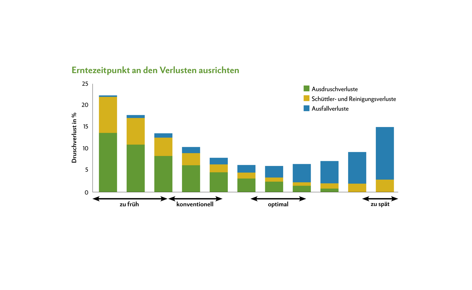 - Die Bestimmung des Erntezeitpunktes ist immer ein Abwägen zwischen Drusch- und Ausfallverlust. Warten lohnt sich.